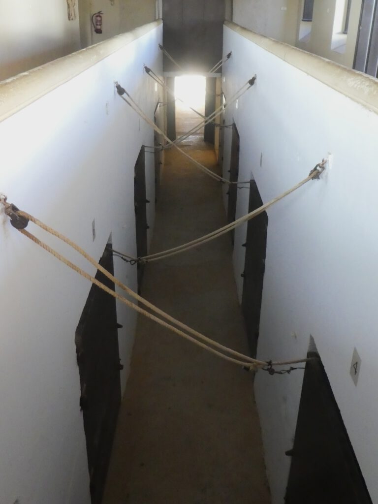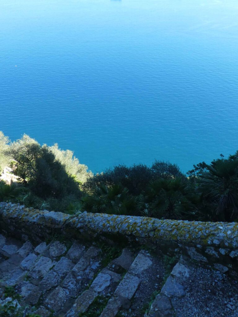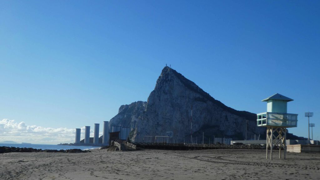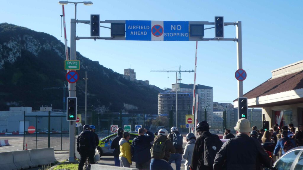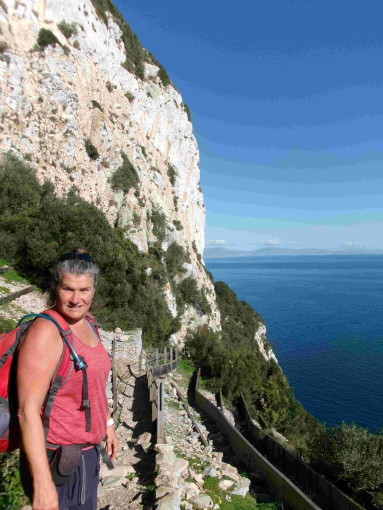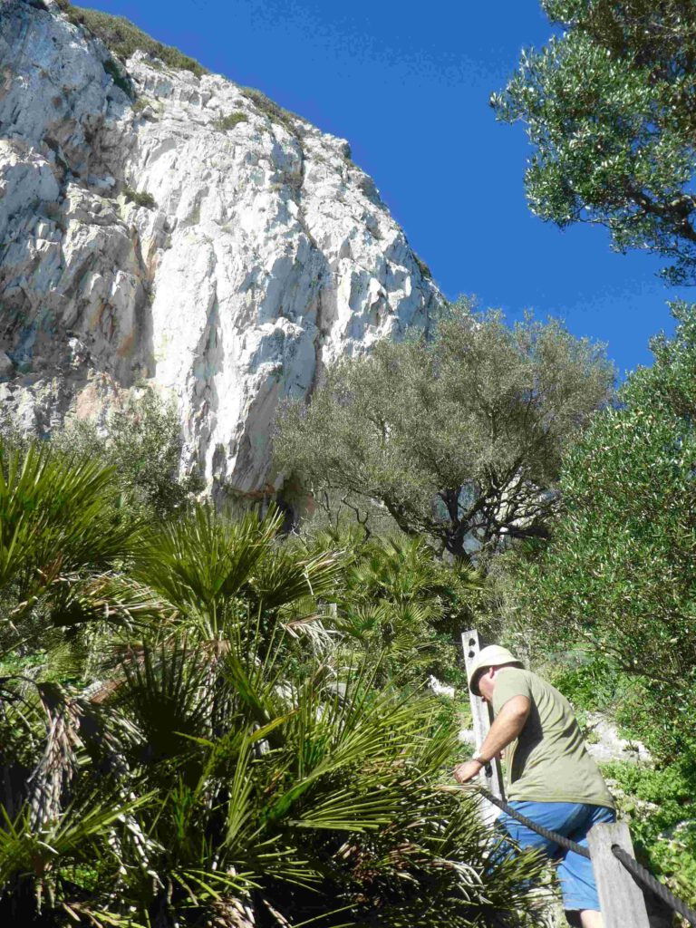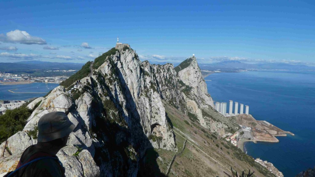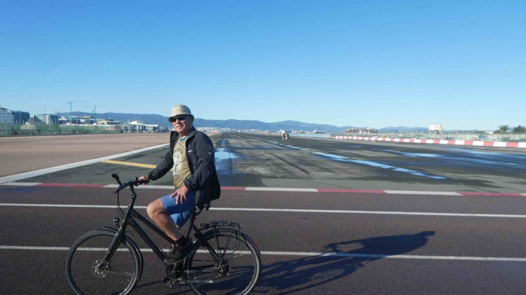 17 december: We stappen na het ontbijt op de fiets naar de grens met (een klein stukje) Groot-Brittannië. De Britse enclave Gibraltar bestaat uit een 426 meter hoge rots, met aan de voet ervan een vreselijke drukke stad. Om er te komen, moeten we langs de Spaanse en Britse douane. Gelukkig is hiervoor geen visum nodig en hoeven we geen bergen formulieren in te vullen😊. Leve de Europese samenwerking (uche-uche). Wanneer we de douane gepasseerd zijn, gaan we door een hek en steken we de landingsbaan van Gibraltar over, tenminste als er geen vliegtuig land of gaat opstijgen! Mocht het toch fout gaan, de begraafplaats van Gibraltar ligt naast de start-landingsbaan. What can go wrong? We fietsen naar het begin van de kabelbaan die naar de top van de rots gaat, maar Karin heeft op internet al gelezen dat deze gesloten is vanwege onderhoudswerkzaamheden. Er staan busjes klaar om je naar boven te rijden, maar dat kost je dan wel de 30 pond entree voor de rots en nog eens 20 pond voor de gegidste rit, die bij alle bezienswaardigheden net even tekort stopt. Aangezien we niet aan een tijdschema gebonden willen zijn, slaan wij het aanbod af en besluiten de mooie wandeling langs de steile oostkant van de rots omhoog te lopen en op eigen houtje alle militaire bezienswaardigheden te bezoeken. Volgens het bordje bij het begin van de Mediterraine Steps is de route naar de top 1,7 km lang, met een hoogteverschil van 248 meter. Het is inderdaad een mooie klim, maar hemeltjelief, wat is het zwaar! In een korte tijd moeten we flink wat hoogtemeters overbruggen met steile, net iets te hoge traptreden. Karin voelt haar hartslag in haar hals behoorlijk tekeer gaan. Gelukkig zijn we niet op 4000 meter hoogte😧. Na een uurtje klimmen komen we aan bovenop de rots. Wat een prachtig uitzicht, zeker met zo’n mooie zonnige dag als vandaag.