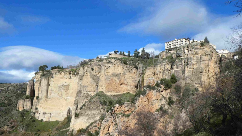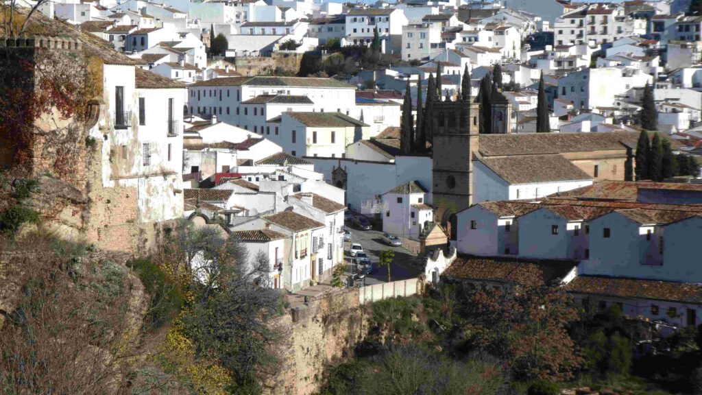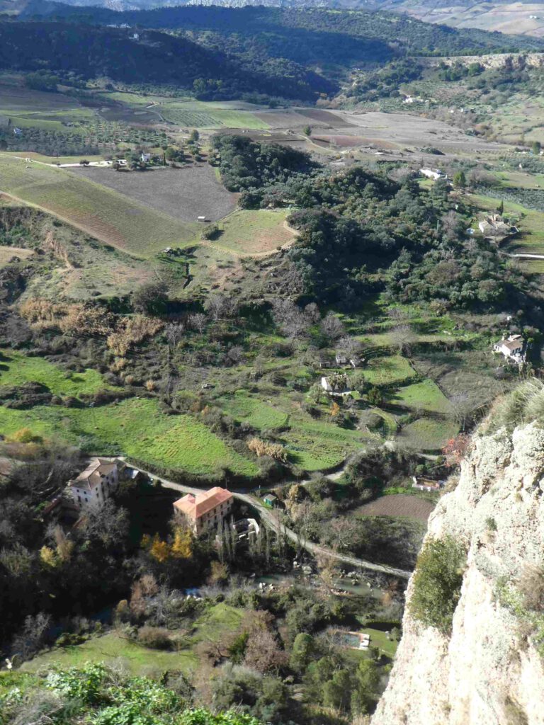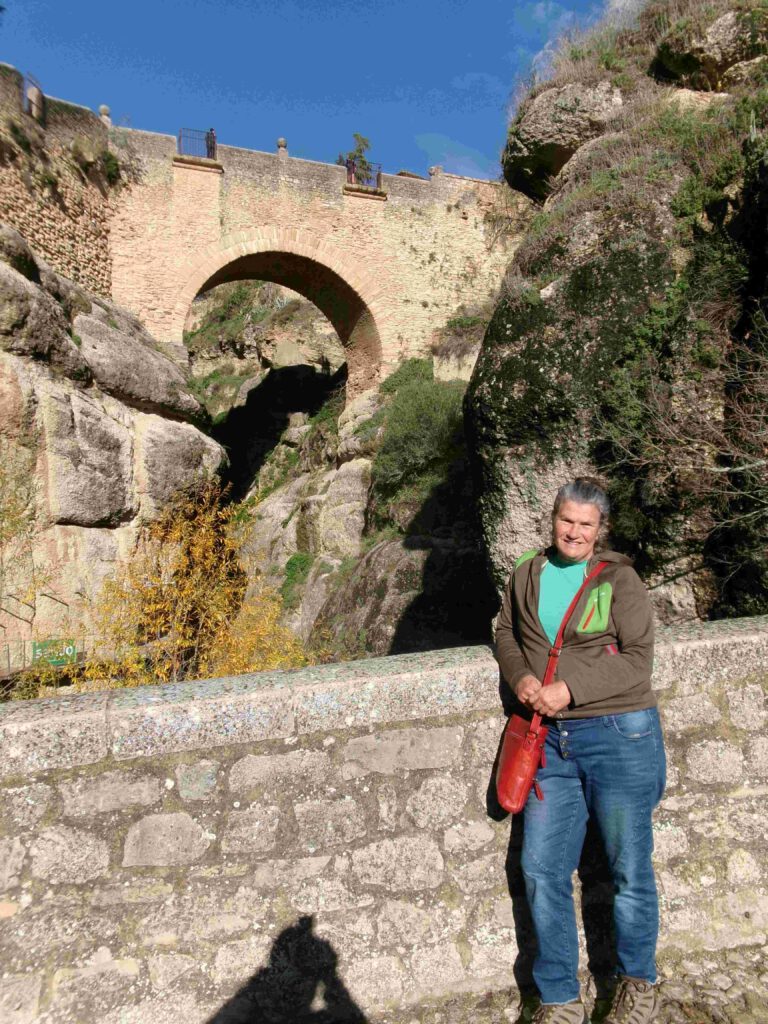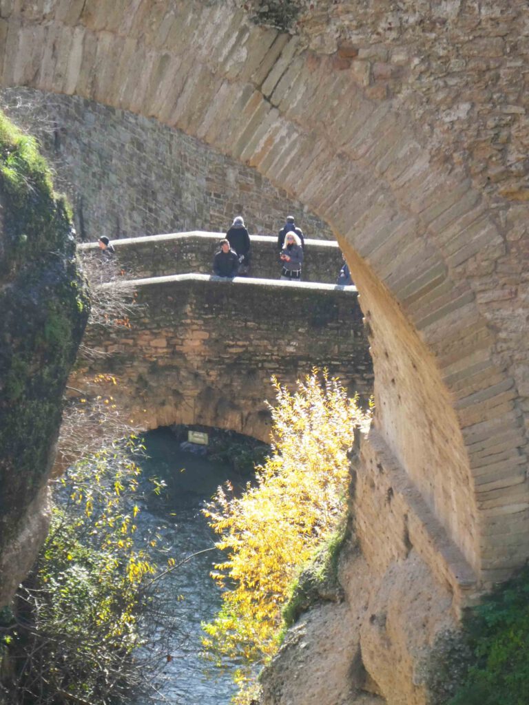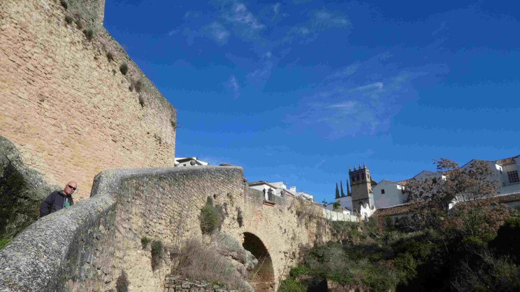 22 december: we staan op met zonneschijn, maar het is wel rond het vriespunt. De plassen op het parkeerterrein zijn bevroren en er ligt een dunne laag verse sneeuw op de toppen van de bergen in de omgeving. De regio wordt niet voor niets Sierra de las Nieves genoemd, wat bergketen van de sneeuw betekent. Dat wordt niet in een hemdje lopen door de stad Ronda vandaag😂. Na het ontbijt stappen we in de auto en parkeren deze vlakbij de kloof waar de stad om bekend staat. Karin is hier in een ver verleden al eens geweest met Esther, maar het aangelegde wandelpad omhoog naar de brug was er toen nog niet, volgens haar. Omdat de zon nog niet hoog genoeg aan de hemel staat, worden er nog geen foto’s van de trekpleister van Ronda gemaakt, maar wandelen we eerst langs de buitenmuren van de stad. De rivier Guadalevin splitst de stad in tweeën en heeft een diepe kloof uitgesneden. Over deze kloof zijn drie bruggen gebouwd, de Puente Arabe, de Puente Viejo en de indrukwekkende 98 meter hoge Puente Nuevo. We wandelen eerst over de eerste twee bruggen.