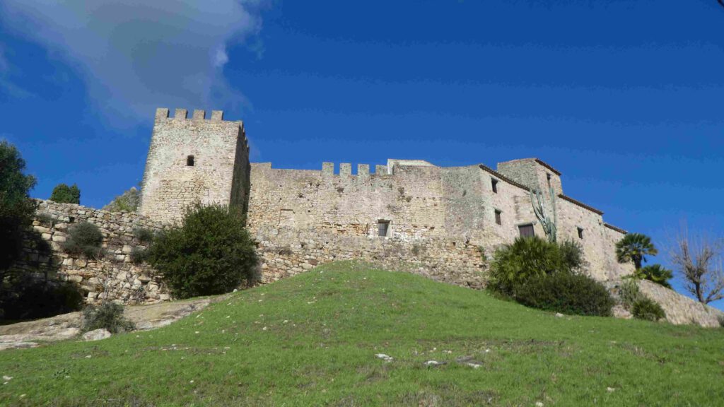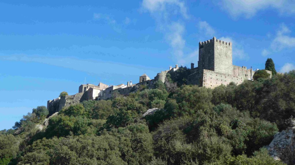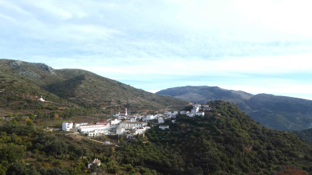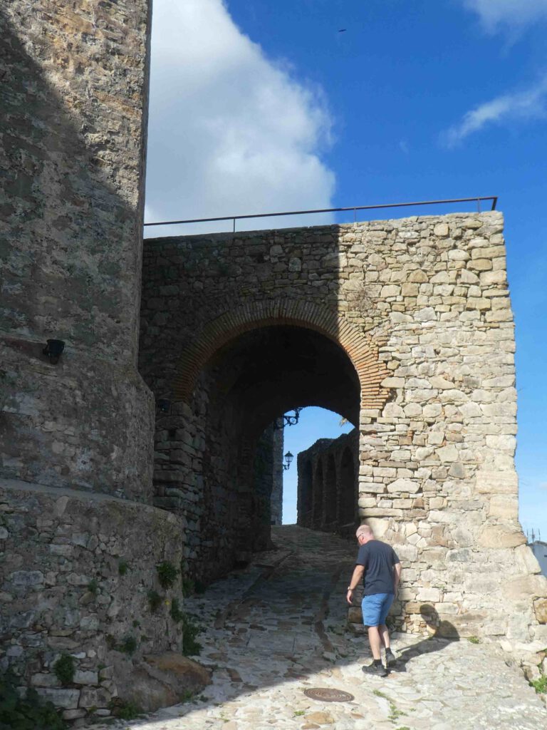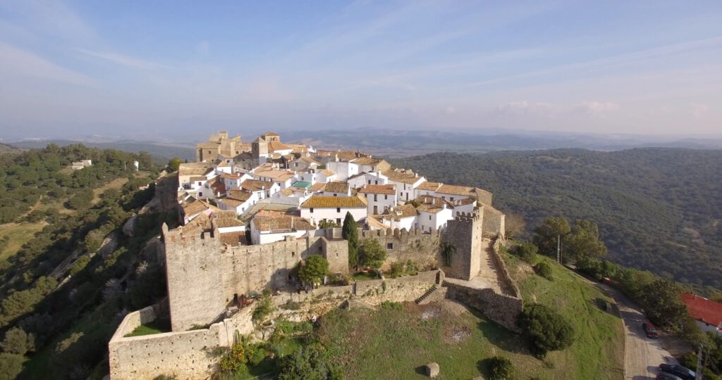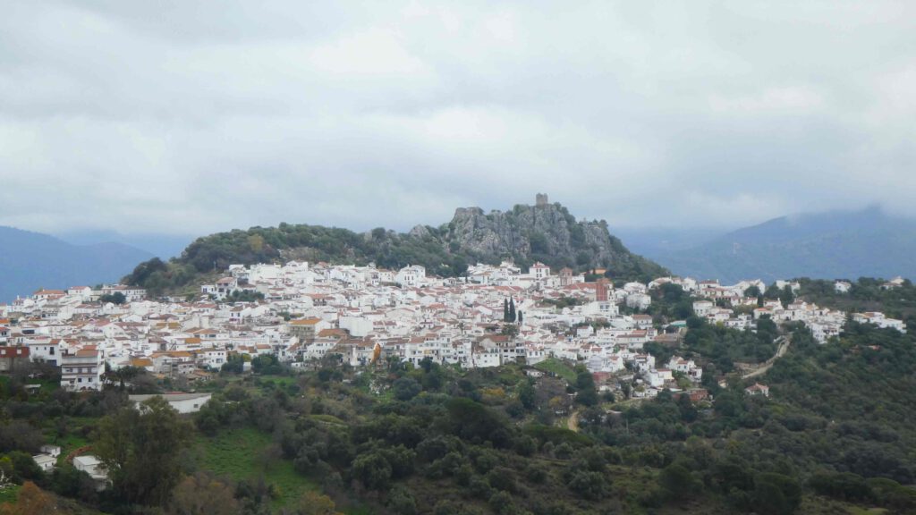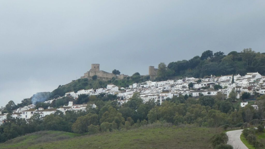 18 december: we verlaten de kust en rijden richting de bergen. De bedoeling is op de gratis camperplaats bij het dorp Castellar Nuevo de la Frontera te overnachten. Alleen voor de prachtige naam van de plaats, wil je hier al een paar dagen blijven. Vergelijk de naam maar eens met ‘Wijk aan Zee’🫠. Vanuit deze plaats kunnen we met de auto naar het mooi ommuurde dorpje, met de ook prachtige naam, Castellar Viejo de la Frontera. Na een relaxte ochtend rijden we weg en bereiken we tegen lunchtijd de mooie camperplaats. We parkeren de caravan, zetten de stoelen buiten en zijn klaar voor de lunch in het zonnetje. Op dat moment komt er een politiewagen langs, die ons verteld dat de caravan daar niet losgekoppeld van de auto mag staan en dat we geen camping gedrag mogen vertonen😤, dus stoelen en tafel weer opbergen! Tja, dan is de conclusie snel gemaakt, we gaan hier niet overnachten. De caravan aankoppelen is geen probleem, maar niet buiten kunnen zitten in de zon en straks niet barbecueën is voor ons geen optie! We ruimen de stoelen en tafel weer op en lunchen dan maar binnen. Om het dorpje te gaan bezichtigen laten we de caravan wel goed op slot geparkeerd staan op de plek, zodat we makkelijker het bergweggetje naar het dorp kunnen rijden. De weg omhoog gaat door prachtig bos met kurkeiken en ook hier zweven vele vale gieren in de lucht. We vragen ons af of ze ook hier bijgevoerd worden, want het zijn er heel veel. Het dorpje ligt mooi bovenop een heuvel en is volledig ommuurd. Via drie groten toegangspoorten wandelen we het piepkleine dorpje in. Jammer dat we drone niet meer hebben, maar Karin heeft een foto van internet afgehaald.