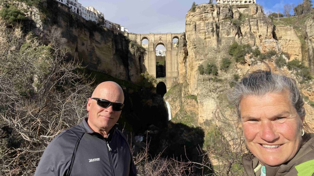 Na de lunch dalen we de kloof af en het licht is nu veel beter om prachtige foto’s te maken. Indrukwekkend om te kijken naar de gebouwen die staan op de hoge rotsen en de brug die beide delen van de stad met elkaar verbindt. Inmiddels is er een hele koude wind uit de bergen gaan waaien en vinden we het niet erg om terug naar de caravan te gaan. Snel de kachel aan en de indrukken nog eens op ons laten inwerken👍.
