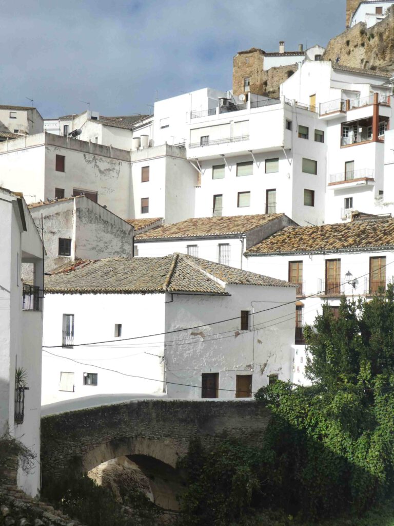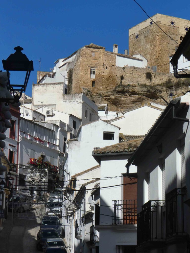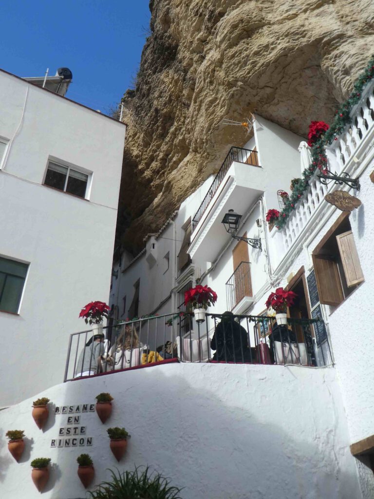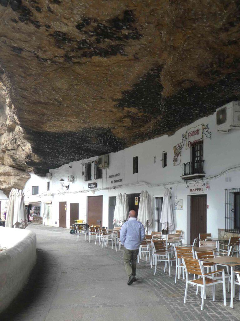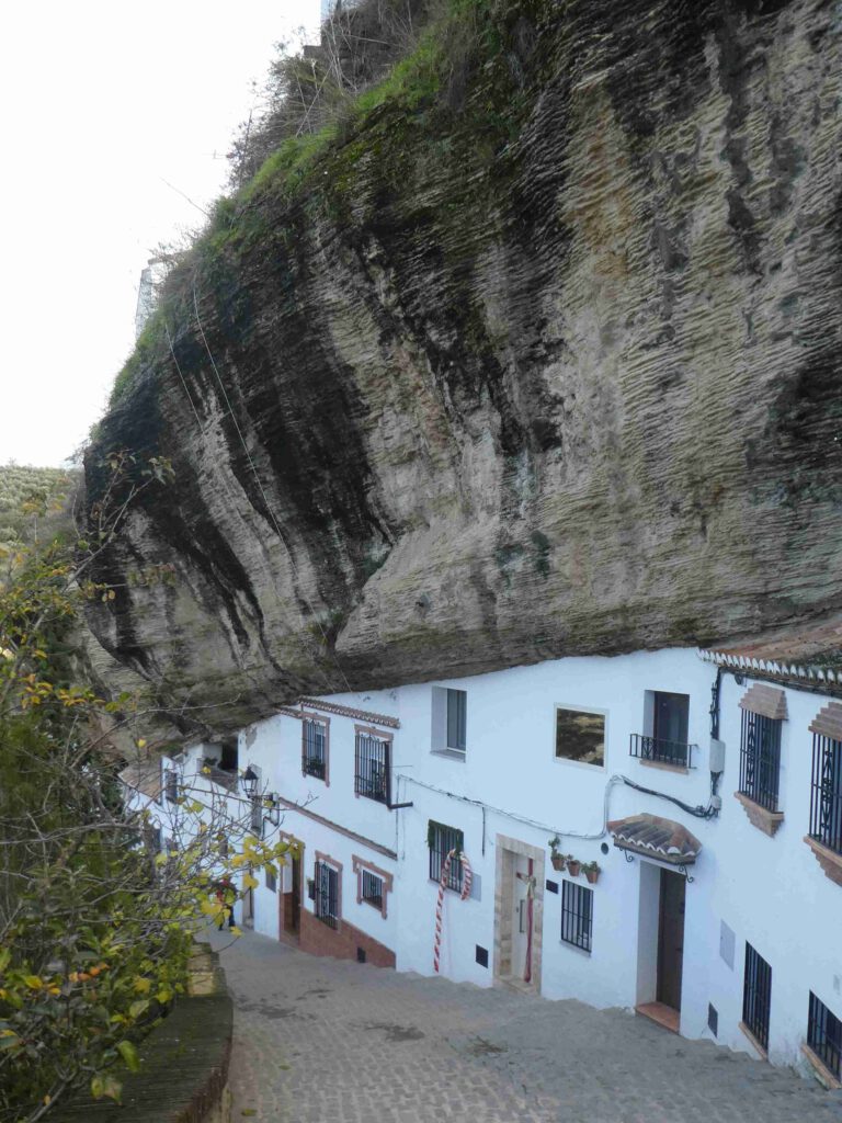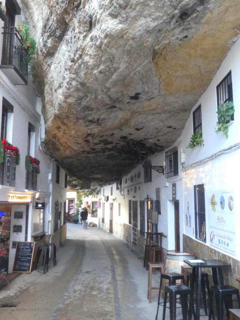 Na de lunch stappen we in de auto en rijden we naar het plaatsje, met de prachtig naam, Setenil de las Bodegas. Deze toeristische trekpleister ligt in een dal dat uitgeslepen is door de rivier Guadalporcún. Met de bouw van de huizen is gebruik gemaakt van de uitgeslepen rots, die de achterkant van het huis of het dak vormt, waardoor het deels ‘grotwoningen’ zijn. We lopen door de leuke straatjes en zijn blij dat het in deze tijd van het jaar zelfs in het weekend niet al te druk is. Zomers zul je hier wel over de hoofden lopen🤨. Men moet buiten op het terras de warme tapas wel snel opeten, want het is vandaag koud. Daar het plaatsje niet erg groot is zijn we snel klaar met de rondwandeling en na bij een uitbater een kopje koffie en thee te hebben genuttigd, begeven we ons naar de caravan. Helaas staat er een koude wind, zodat we niet buiten op ons eigen terrasje gaan zitten😉. Gido steekt wel de BBQ aan, wat gisteravond vanwege de regen helaas niet mogelijk was. Het is soms behelpen geblazen😂.