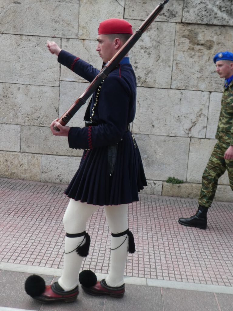 Inmiddels is de ochtend alweer bijna voorbij, maar blij dat we over een paar dagen niet terug naar Athene hoeven, lopen we dit keer vrolijk de stad in. Nu kunnen we gelukkig wel genieten van de Griekse oudheden en leuke straatjes, die wij gisteren niet opgemerkt hebben😁. De wijken net onder de Akropolis zijn heel gezellig en zeker de moeite waard om doorheen te slenteren. Bij de kathedraal gaan we op een terrasje uitgebreid lunchen. De voettocht gaat daarna verder, onder andere langs de oude Agora, de wijk Monastiraki en we zien de wisseling van de wacht bij het monument van de onbekende soldaat. De wachtposten moeten een uur geheel stilstaan, voordat ze weer afgelost worden. We eindigen onze wandeltocht op de heuvel Areopagus, waar we een fantastisch uitzicht hebben over de gehele stad. Omdat we alle hoogtepunten, weliswaar vanaf een afstandje, hebben bekeken en moe zijn van het slenteren door de drukke, maar ó zo gezellige straatjes, pakken we de metro en de bus aan het einde van de middag terug naar de camping. We zijn erg blij dat we niet nog een keer met eigen vervoer over deze bizarre wegen hoeven te rijden. De buschauffeur heeft er kennelijk helemaal geen moeite mee🤗. Morgen maar zien hoe we veilig met de caravan achter ons aan op de snelweg komen. Dan gaan we weer relaxen op het platteland!