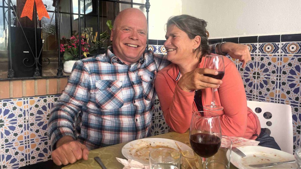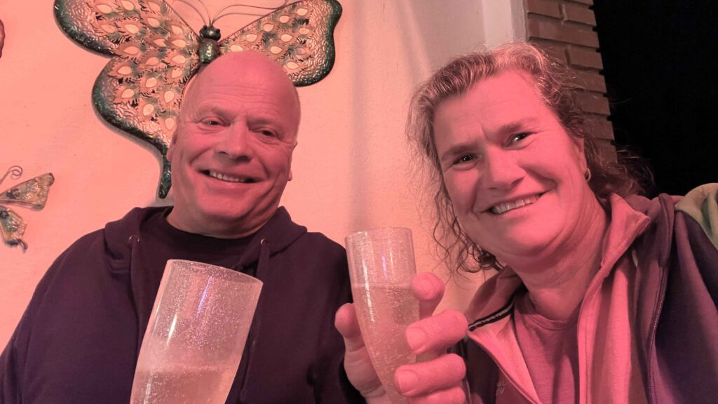 Karin bekijkt de Maps.me app en we besluiten om dan maar gewoon de bergen in te wandelen over een breed pad. Het uitzicht is mooi en na twee uur relatief relaxed wandelen, zijn we terug bij de auto. De zon schijnt nog op de camperplek, dus installeren we ons met een paar tapas voor de caravan. Gido steekt de BBQ aan voor een lekker visje. We eten niet te veel, want om 22.00 is het terras geopend met oliebollen en cava. We hebben genoten van de avond met onze mede overwinteraars en proosten op het nieuwe jaar🥂! We wensen iedereen een gezond en liefdevol 2026 toe en hopelijk zien we elkaar snel weer.