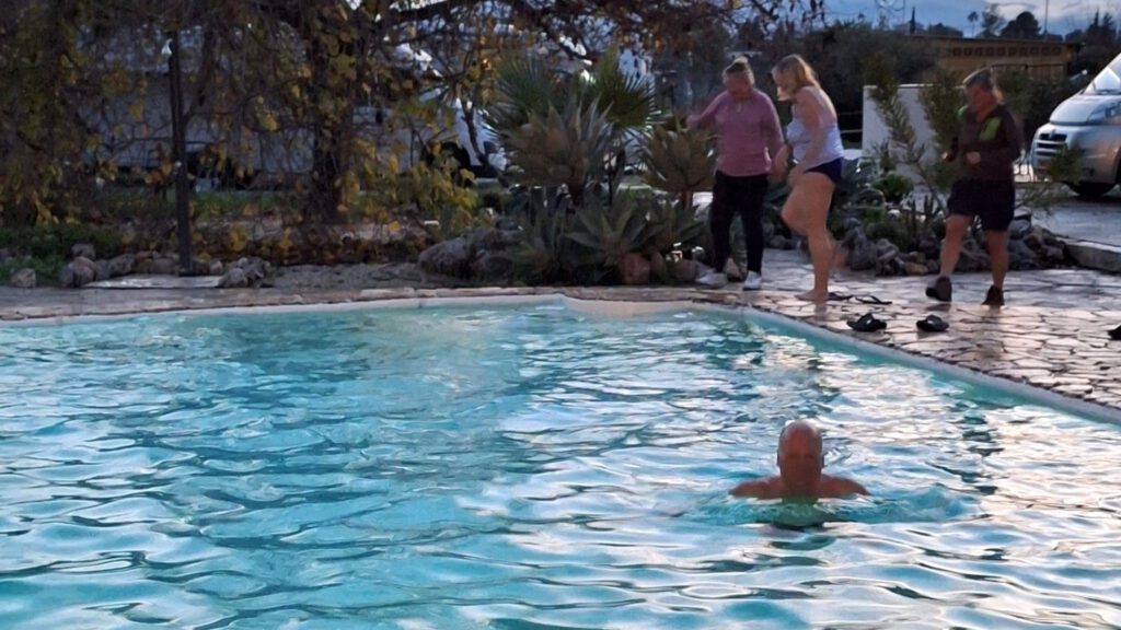 28 december: het gesprek van de dag; wat een noodweer gisteravond! Blijkt dat er allerlei filmpjes op internet te vinden zijn van de overstromingen hier in de buurt. Gelukkig hebben wij daar geen last van gehad. Wel staat een deel van de camperplek onder water, maar dat wordt door Marcel opgelost door vlonders neer te leggen, zodat de buren toch droge voeten houden als ze hun camper uitstappen. Voor vandaag wordt er helaas weer regen voorspelt, zodat we een beetje relaxen in en rond de caravan. Wanneer ’s middags uiteindelijk de zon zich laat zien, maken we een korte wandeling vanaf de camperplek. Bij terugkomst schuiven we aan op het terras, want daar wordt gezellig geborreld door een aantal mede kampeerders. Na een paar biertjes en grootspraak, vinden Jan en Gido het nodig om een duik in het ijskoude water te nemen. Dat laat Diana zich geen twee keer zeggen en zij doet stoer mee. Karin verklaart ze voor gek en houdt wijselijk haar kleren aan😂.