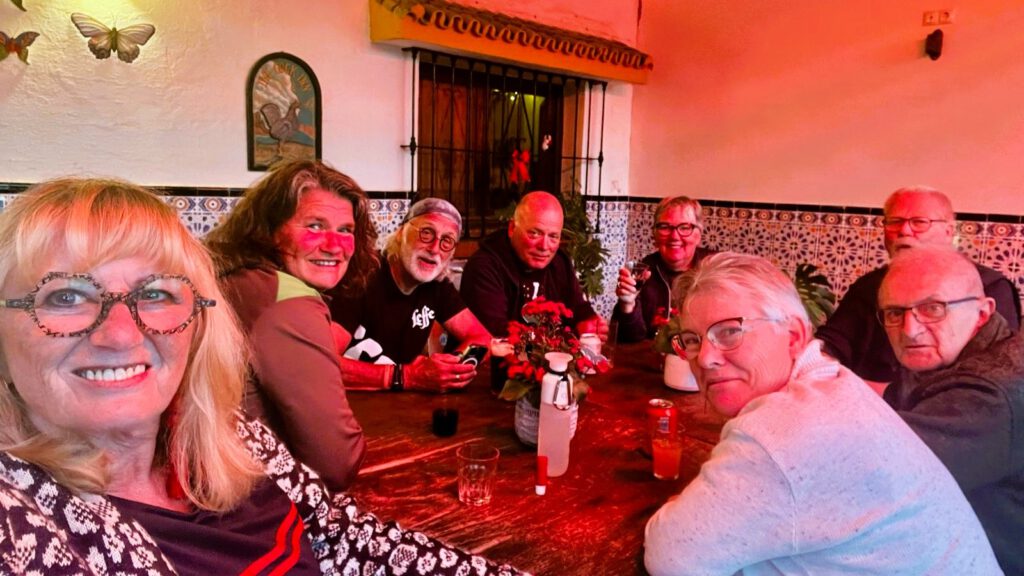 25 december: Karin vindt het nodig om de caravan van binnen eens goed te poetsen; je moet toch wat op een rustdag hé😁? Vanaf 14.00 staat er een tapasmiddag op het programma, samen met de andere kampeerders. Het wordt een gezellige middag, met 18 verschillende lekkere hapjes. Gelukkig is het niet al te koud, maar Marcel (de eigenaar) heeft voor de zekerheid toch maar twee straalkachels opgehangen boven het terras👍. tegen de tijd dat de hapjes op zijn en de zon ondergaat, vertrekken de meeste mensen weer naar hun warme camper. Onze tafel blijft echter nog gezellig natafelen, maar ook voor ons wordt het, na vijf uur zitten aan tafel, tijd om languit op bed te gaan loungen. Marcel en Maybritte, bedankt voor deze geslaagde middag!