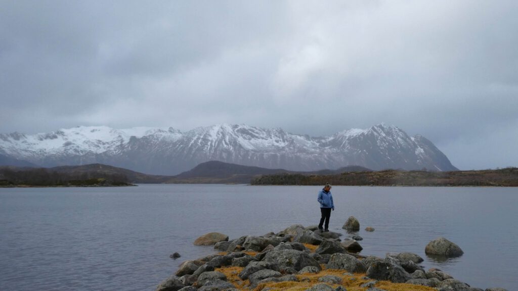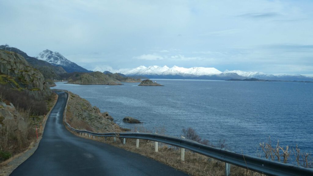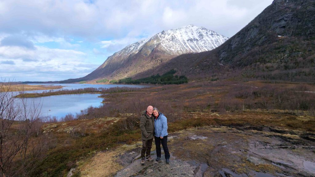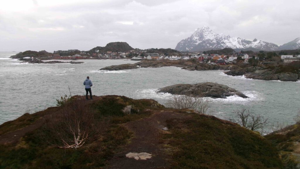 Op de terugweg stappen we nog een paar keer uit om te genieten van het uitzicht over de zee. De bergen rijzen bijna loodrecht uit de zee en op de flanken ligt nog sneeuw. In de zomer is de Lofoten een walhalla voor bergwandelaars, nu wordt het nog afgeraden. In de lagere delen ligt geen sneeuw meer, maar daar is het toendralandschap volledig volgezogen met water en zul je diep wegzakken. Karin gaat op zoek naar geplaveide paadjes😉.