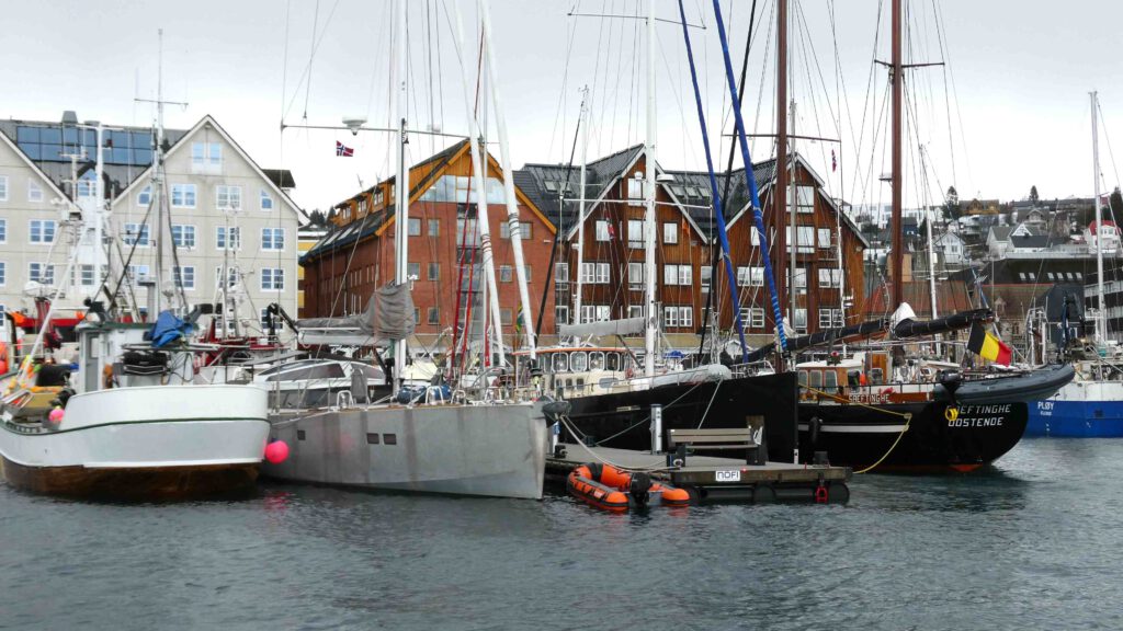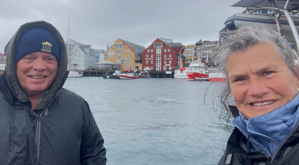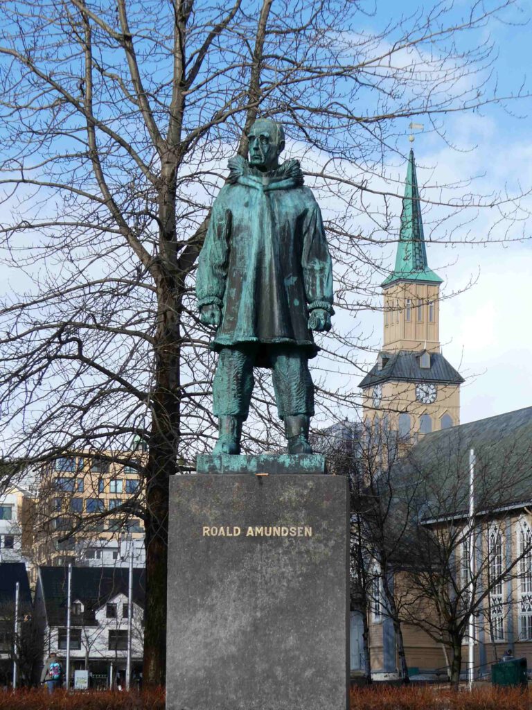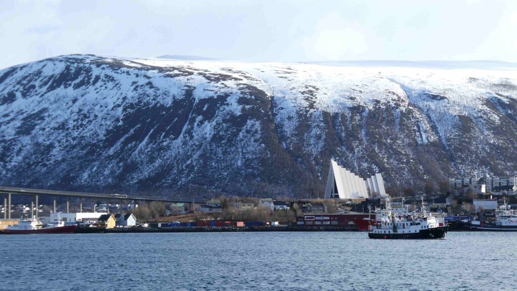 20 maart: na een goede nachtrust begeven we ons naar het immens uitgebreide ontbijtbuffet. Van verse moten zalm en garnalen t/m full Englisch breakfast liggen voor ons klaar, of worden ter plekke bereid. Normaal eten we ’s ochtends havermout, maar nu doen we ons tegoed aan de vele lekkernijen. Wat een feest! Helemaal ingepakt tegen de weersinvloeden wagen we ons daarna naar buiten. Het hotel ligt bij de haven, dus de wandeling voert ons daarlangs. We zien een heleboel toeristen aan boord van een schip gaan, waarmee ze op open zee een walvissafari gaan maken. Hopelijk worden ze niet zeeziek en zien ze in dit jaargetijde nog walvissen🤔. Ons idee om aan de overkant van het fjord met de kabelbaan de huisberg van Tromso op te gaan is helaas niet mogelijk. De kabelbaan wordt gerenoveerd en de wandelwegen zijn geheel verijsd. Nu is het weer ook een spelbreker, want naast de regen waait het ook heel hard. Wij zoeken de warmte op in het Polar museum, waar we leuke informatie over de Noordpoolexpedities krijgen en over de reizen van Roald Amundsen naar de Zuidpool en de Noordpool. Na al het geslenter is het goed uitrusten op de hotelkamer, waar we meegebracht supermarkteten oppeuzelen met een biertje erbij.