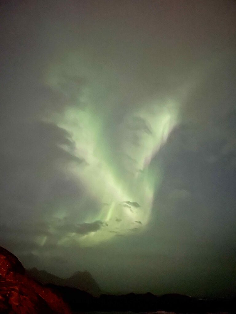Om 18.00 stappen we in de bus en de reis verloopt voorspoedig, ondanks de enorme tegenwind die de buschauffeur moet trotseren. Ook nu genieten we volop, want het landschap is prachtig. Om 20.00 komen we eindelijk in Svolvaer aan en lopen we in het donker naar ons appartement met uitzicht op zee. Onderweg zien we een paar sterren en de maan aan de hemel staan. Het zal toch niet waar zijn dat we het noorderlicht kunnen gaan zien?! En warempel, er verschijnt een licht groene gloed aan de hemel en heel even kunnen we genieten van het bijzondere schouwspel. Nog niet in haar volle glorie, maar hier zijn we al meer dan blij mee😍!
