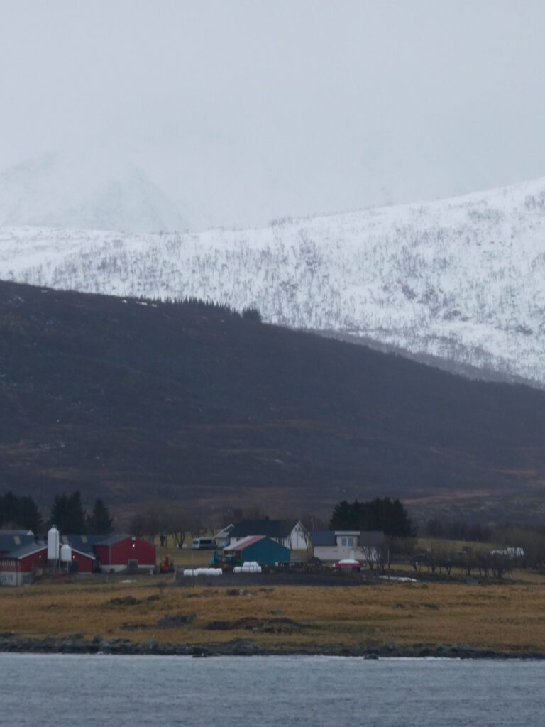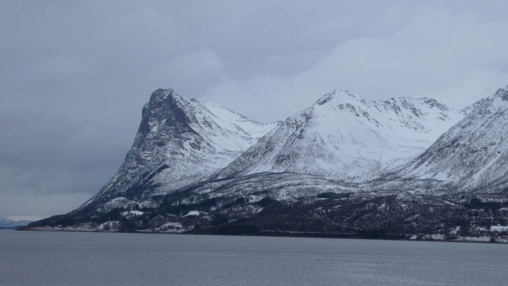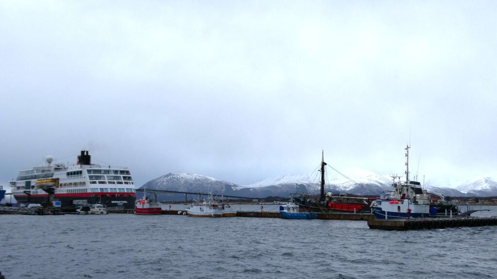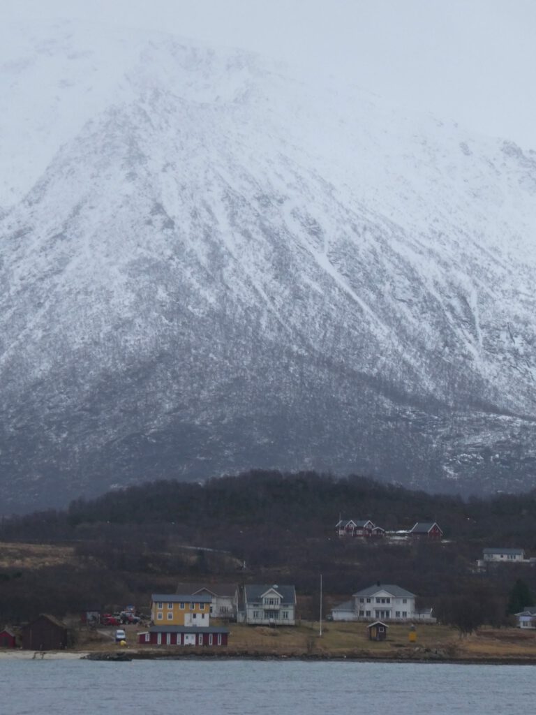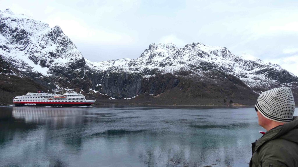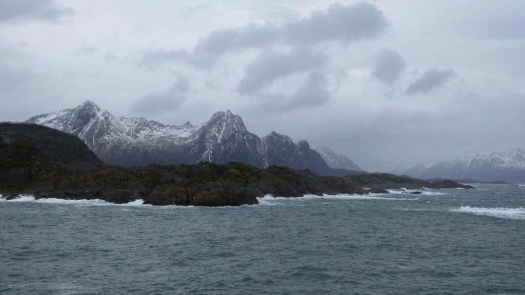 22 maart: Karin is veel te vroeg wakker en ontzettend nieuwsgierig naar het uitzicht. De weergoden zijn ons een beetje gunstig gezind, want het is droog en af en toe prikt zelfs een waterig zonnetje door het wolkendek. Wat varen we door een prachtig mooie omgeving! Het fototoestel maakt overuren en Gido moet Karin smeken om toch echt eens naar het ontbijtbuffet te gaan😉. Maar niet voordat ze het autoverhuurbedrijf in Svolvaer belt om te informeren of ze een huurauto vanuit Stokmarknes kunnen regelen. Helaas hebben ze daar geen verhuurbedrijf 😤. Er zit niets anders op dan met de bus verder te gaan. De optie om vanaf Stokmarknes de veerboot te nemen wordt afgeraden, omdat deze waarschijnlijk vanwege het slechte weer niet zal varen. Dan zullen we nog eerder de boot moeten verlaten in Sortland. Jammer hoor, want de bootreis is echt geweldig!