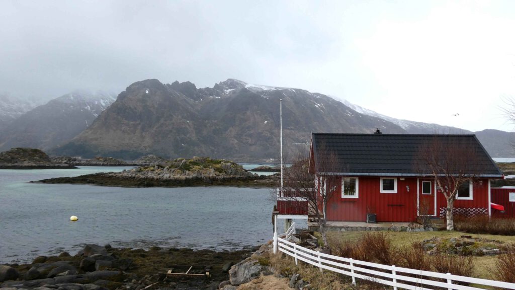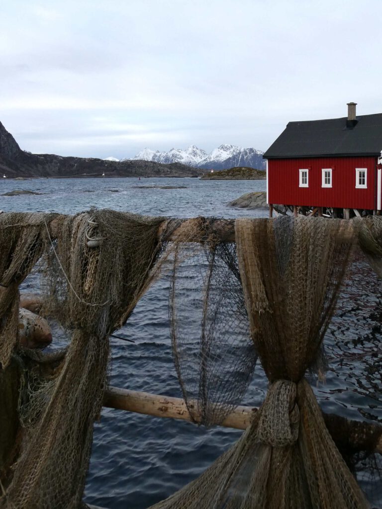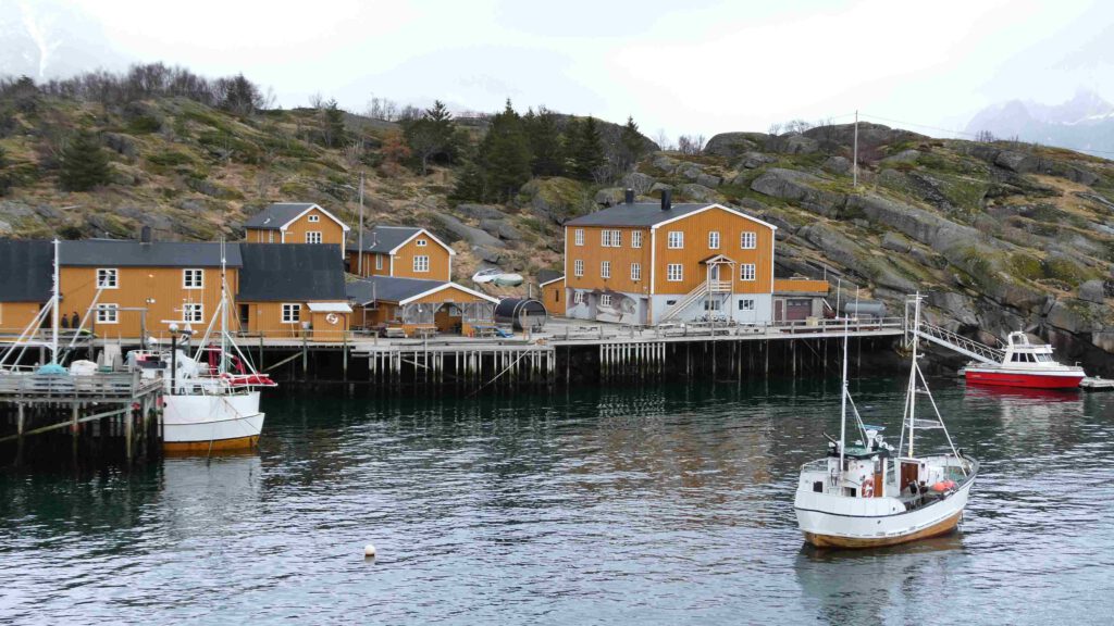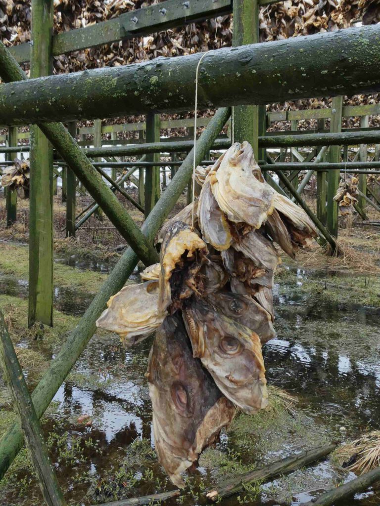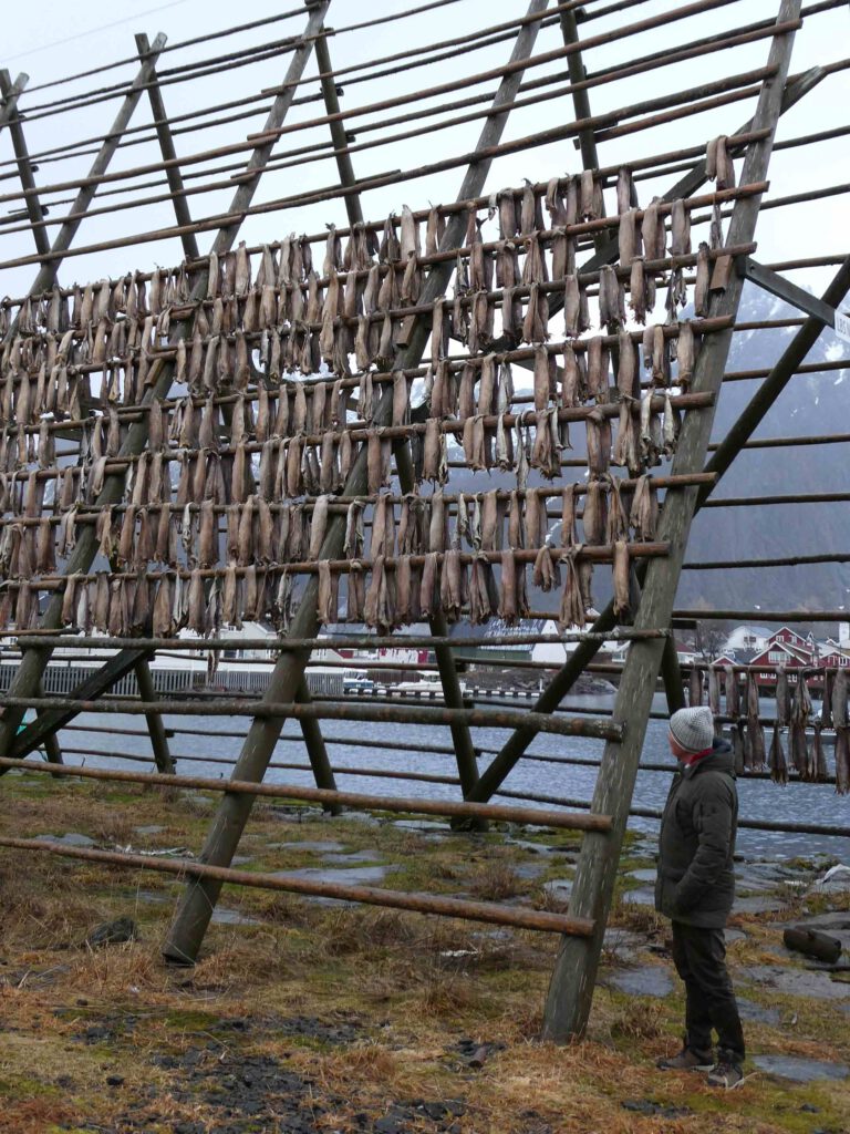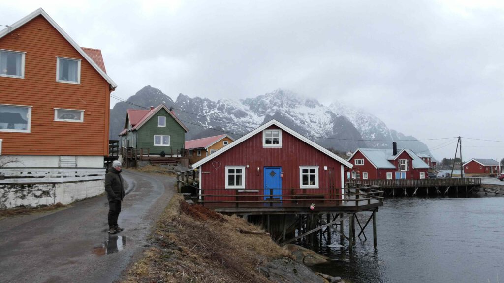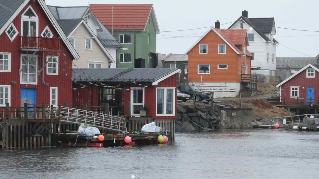 We rijden weer een stukje verder en stoppen bij Het Vikingmuseum in Borg. Het grote Vikinggebouw dat in 1983 werd ontdekt, is volledig gereconstrueerd. Het is met haar lengte van 83 meter het grootste langhuis dat ooit gevonden is in Europa. Na het bezoeken van het museum rijden we nogmaals een zijweg in en komen we uit bij het dorp Eggum, waar weer een heleboel vissenkoppen te drogen hangen. Volgens internet worden deze vermalen en gebruikt in gerechten, vooral geliefd in Afrika🤔. Inmiddels is het alweer einde van de middag en wordt het tijd om terug te keren naar ons appartement. Karin neemt nog een paar foto’s van de oorspronkelijke vissershuisjes, om de hoek van ons appartement.