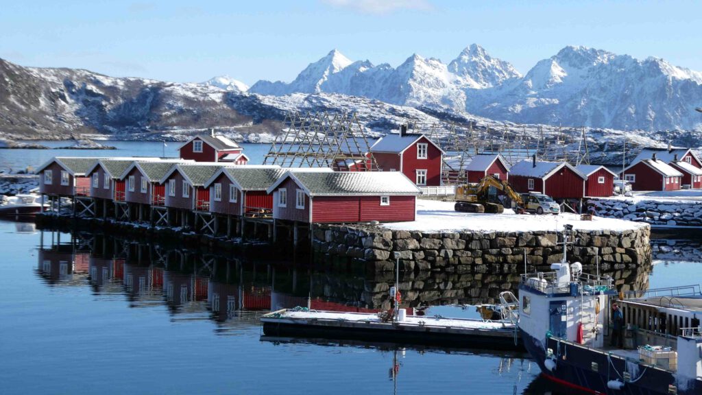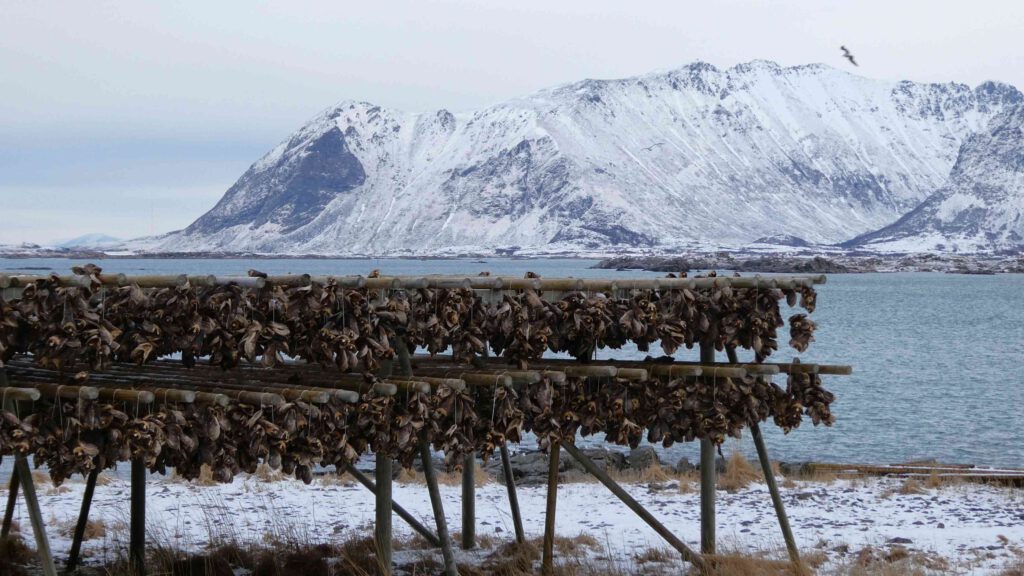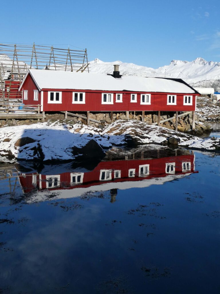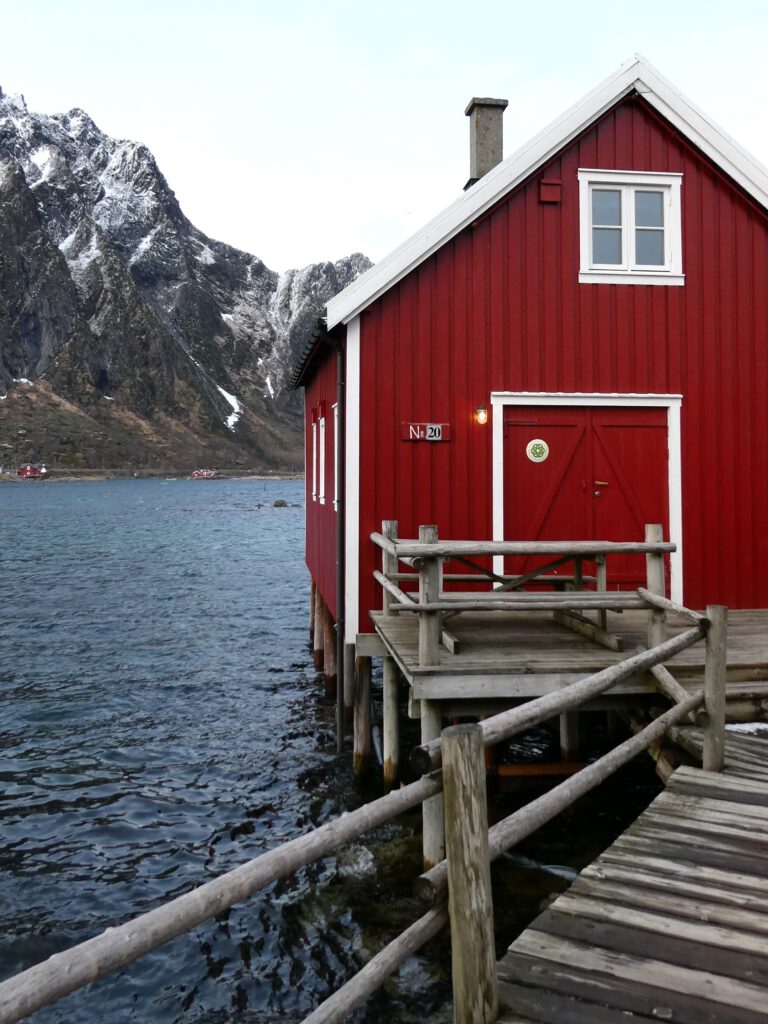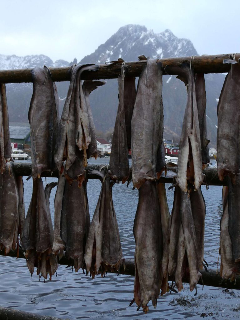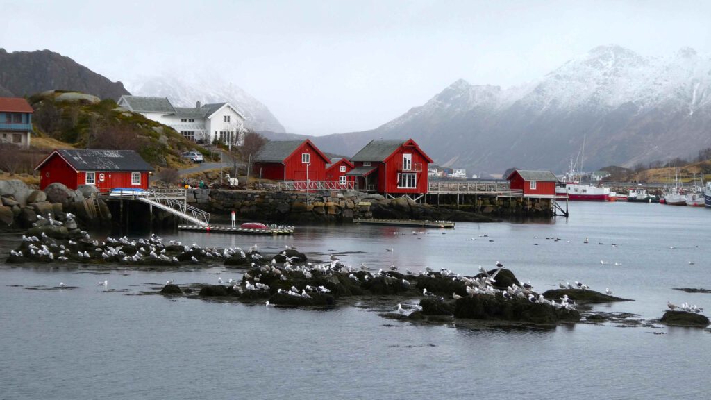 We rijden weer een stukje verder en stoppen bij Het Vikingmuseum in Borg. Het grote Vikinggebouw dat in 1983 werd ontdekt, is volledig gereconstrueerd. Het is met haar lengte van 83 meter het grootste langhuis dat ooit gevonden is in Europa. Na het bezoeken van het museum rijden we nogmaals een zijweg in en komen we uit bij het dorp Eggum, waar weer een heleboel vissenkoppen te drogen hangen. Volgens internet worden deze vermalen en gebruikt in gerechten, vooral geliefd in Afrika🤔. Inmiddels is het alweer einde van de middag en wordt het tijd om terug te keren naar ons appartement. Karin neemt nog een paar foto’s van de oorspronkelijke vissershuisjes, om de hoek van ons appartement.