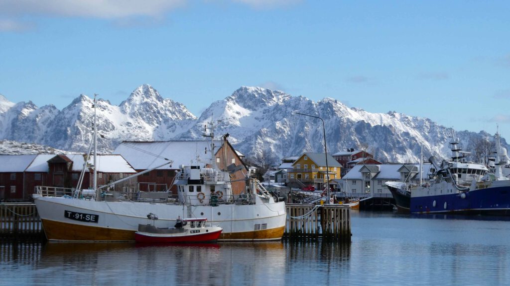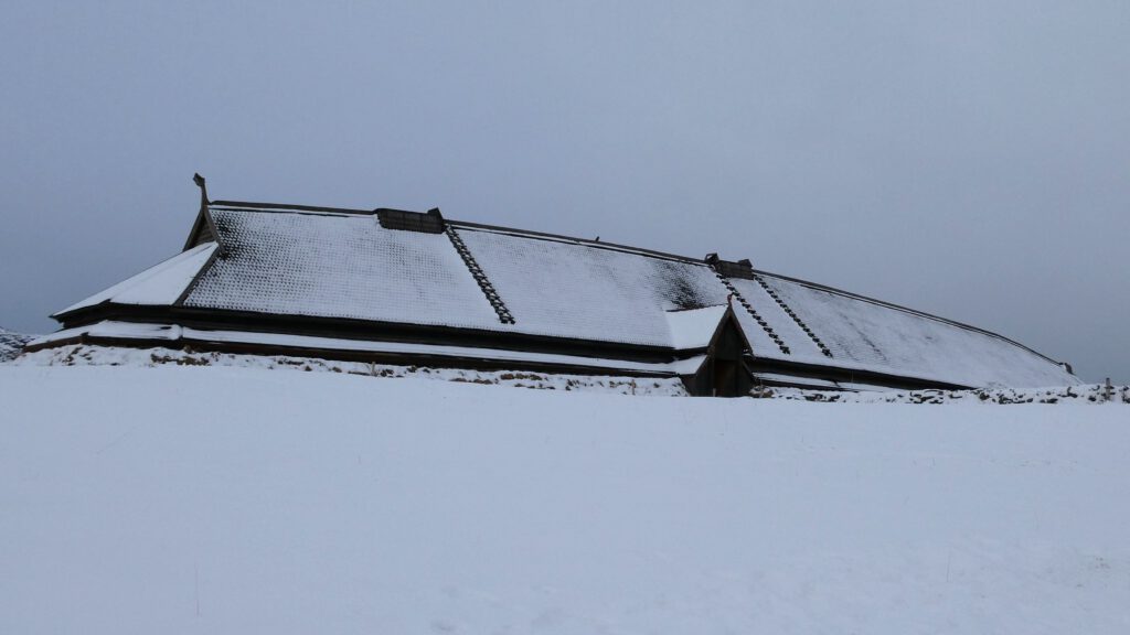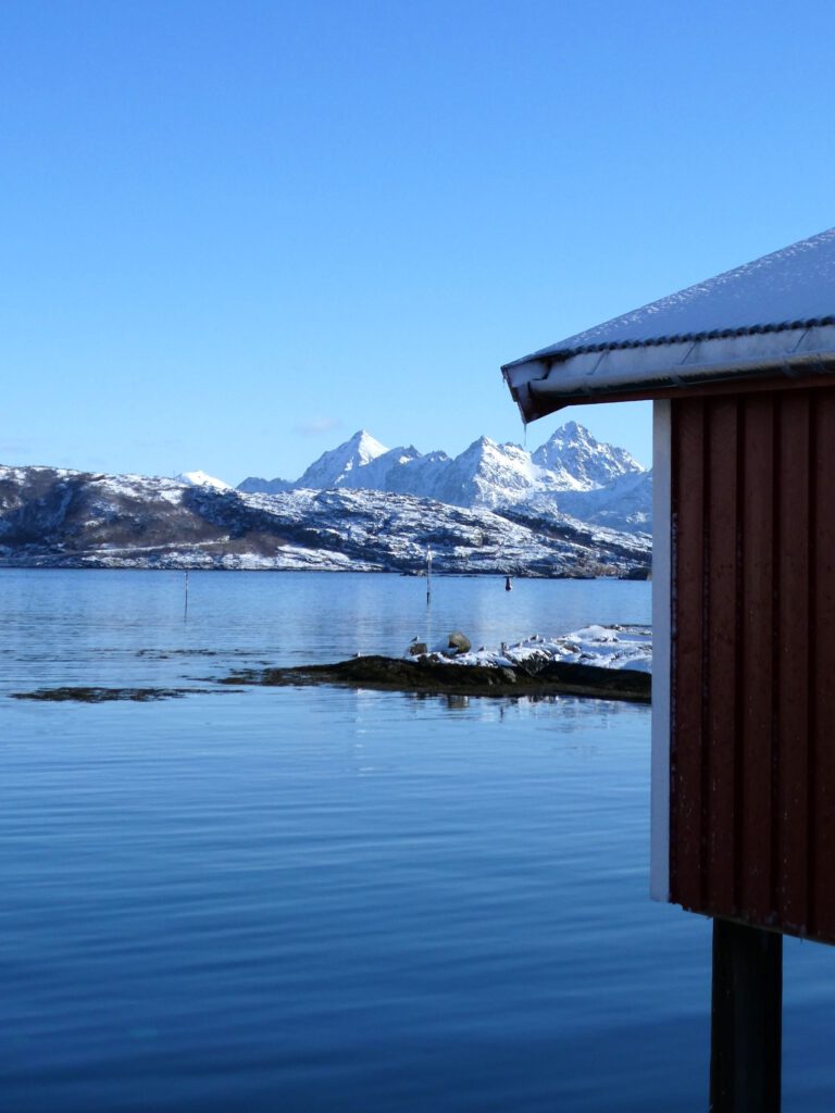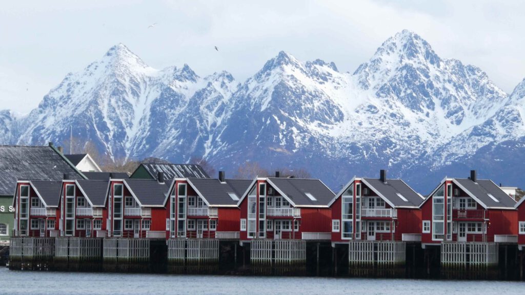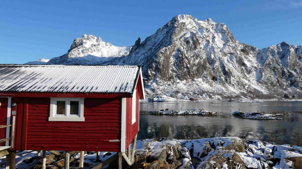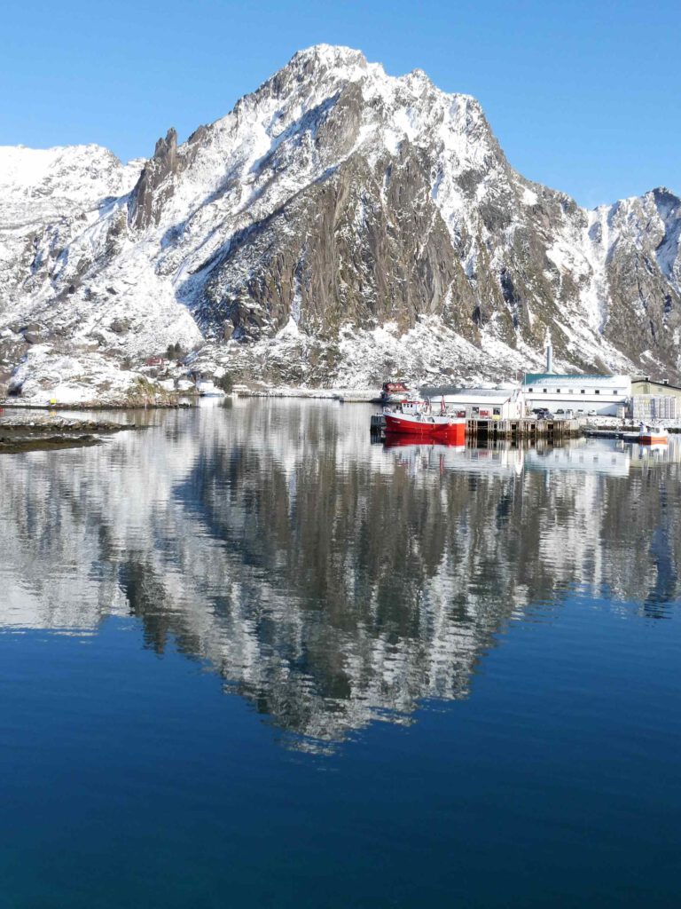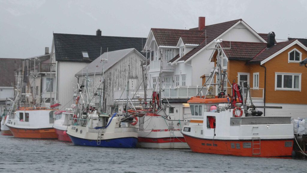 We rijden weer een stukje verder en stoppen bij Het Vikingmuseum in Borg. Het grote Vikinggebouw dat in 1983 werd ontdekt, is volledig gereconstrueerd. Het is met haar lengte van 83 meter het grootste langhuis dat ooit gevonden is in Europa. Na het bezoeken van het museum rijden we nogmaals een zijweg in en komen we uit bij het dorp Eggum, waar weer een heleboel vissenkoppen te drogen hangen. Volgens internet worden deze vermalen en gebruikt in gerechten, vooral geliefd in Afrika🤔. Inmiddels is het alweer einde van de middag en wordt het tijd om terug te keren naar ons appartement. Karin neemt nog een paar foto’s van de oorspronkelijke vissershuisjes, om de hoek van ons appartement.