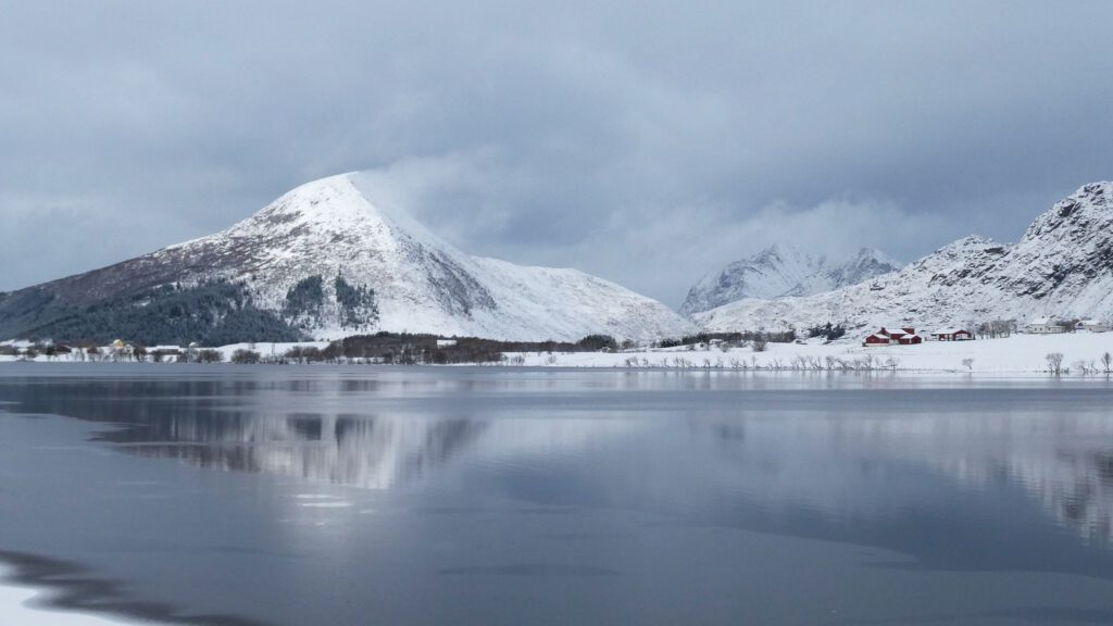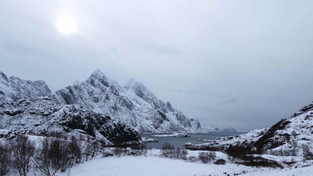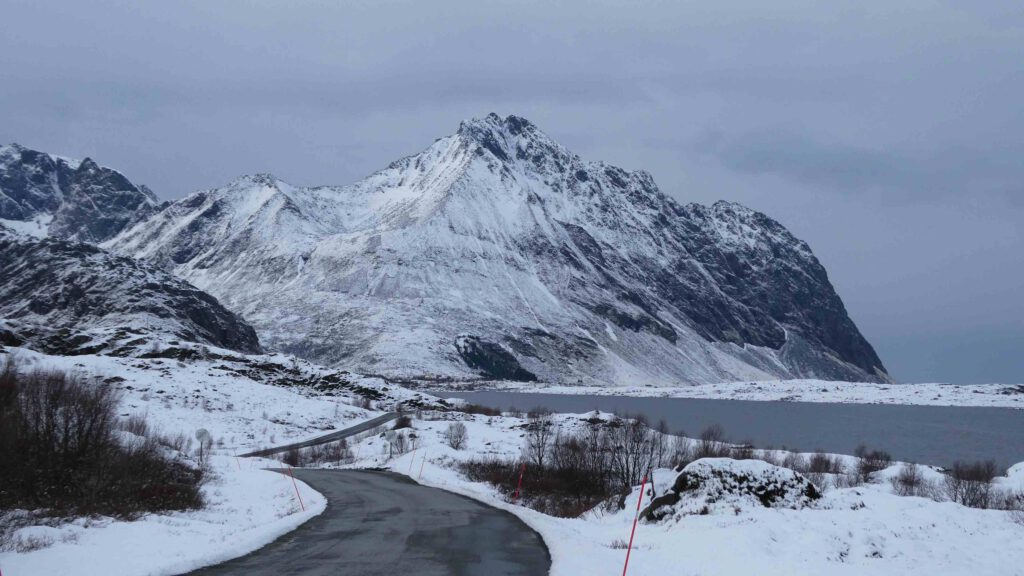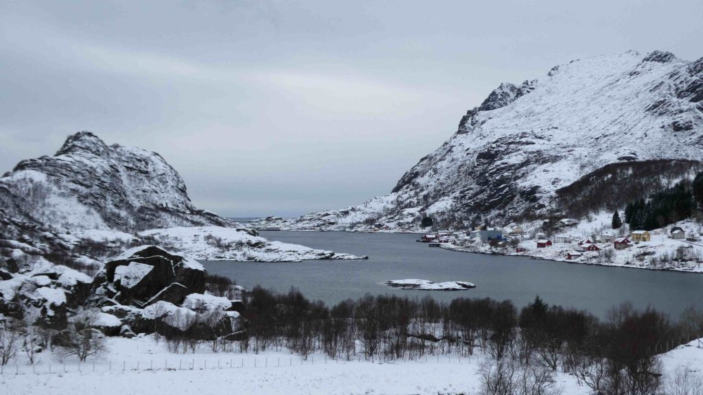 24 maart: het heeft vannacht gesneeuwd. Hebben we toch nog iets aan de spikebanden onder de auto😉. We gaan onderweg naar het verste punt van de Lofoten, het dorpje A. Dat is ongeveer 130 km rijden. Dat lijkt niet ver, maar door de kronkelige wegen zullen we hier meer dan twee uur over doen en dan hebben we de stops onderweg nog niet meegerekend😁. Het landschap is een stuk witter geworden en ziet er betoverend uit. Wanneer we in de buurt van het eiland Flakstadoya komen, moeten we opeens achteraan sluiten in een file. Er wordt gewerkt aan de Nappstraumtunnel op de weg naar A en dat betekent dat er op gezette tijden eenrichtingsverkeer is. Onze kant moet nog driekwartier wachten, waar we geen zin hebben. Mede omdat we daarna nog ruim een uur moeten rijden en we afhankelijk zijn van het schema van de rijrichtingen. We keren om en gaan gewoon andere mooie plekjes bezoeken. Aangezien we toch geen Instagram-account hebben, hoeven we de geijkte foto’s niet te maken😉.