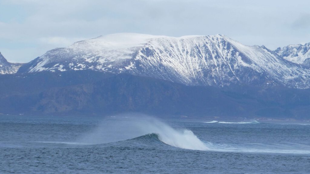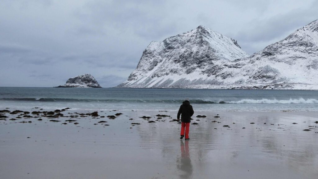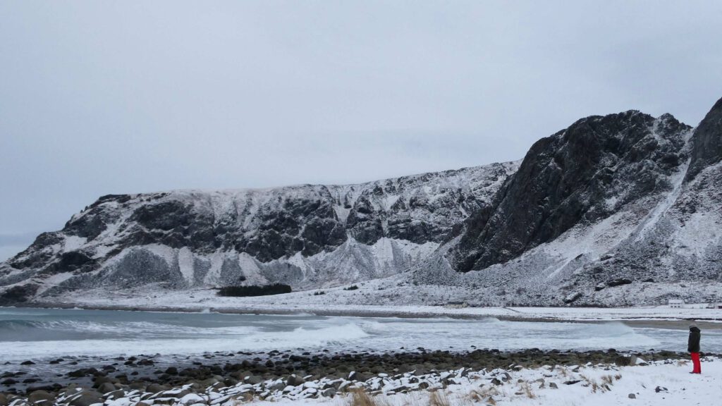 Op het eiland Vestvagoya rijden we een zijweg in en komen uit op het strand van Haukland (foto rechts boven). Hier strekken we de benen even, maar niet te lang want er staat een ijskoude wind. Een aantal kilometers verder doen we hetzelfde en komen we via een mooie bergweg aan op het strand van Unstad. Hier trotseren een aantal golfsurfers de kou. Vol bewondering kijken we naar ze, maar vragen ons wel af of ze niet beter naar de zuidkust van Spanje of Portugal kunnen gaan😂.