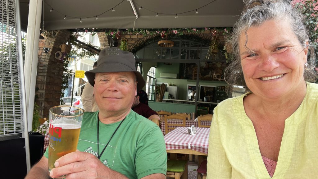 16 maart: we zijn vroeg wakker want het F1 seizoen is weer begonnen! Gido kijkt onder genot van een kop koffie op bed naar de race, terwijl Karin maar weer eens de route voor de aankomende dagen aan het bekijken is. Belangrijk hierbij is, dat we een plek vinden om onze wc te ledigen en dat we drinkwater kunnen tappen. Na het ontbijt rijden we naar het skigebied aan de voet van de Psilli Korifi, een van de hoogste bergen van de Peloponnesos. Hier ligt nog aardig wat sneeuw, maar de gondel werkt alleen nog voor dagjesmensen, dus het wordt met vellen onder de ski’s de berg oplopen als je nog wilt skiën. Wij lopen naar het midden-station en bewonderen de pistes. Best grappig om bij zulk mooi voorjaarsweer op een piste rond te lopen, maar naar de top wandelen gaat door ons echt niet gebeuren vandaag😂. Terug in Kalavryta is het gezellig druk. We slenteren nog wat door de straatjes, waar nu heel veel mensen op terrasjes zitten en kopen bij een slager een kilo worst van everzwijn en rund. Dat zal (hopelijk) smaken op de BBQ😊. NB: Gido draagt nog geheel onterecht de fleecetrui die hij op de piste aan had😉.