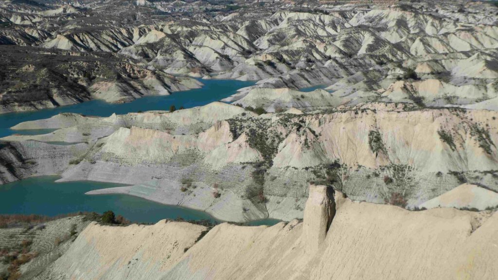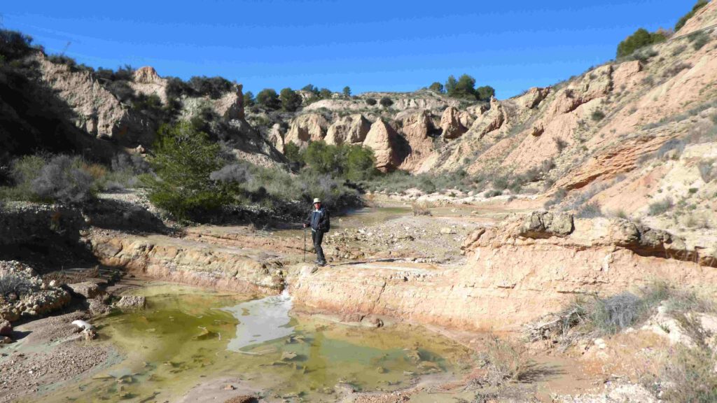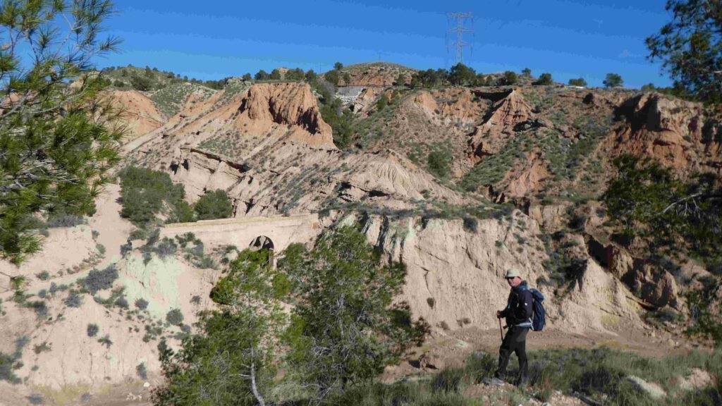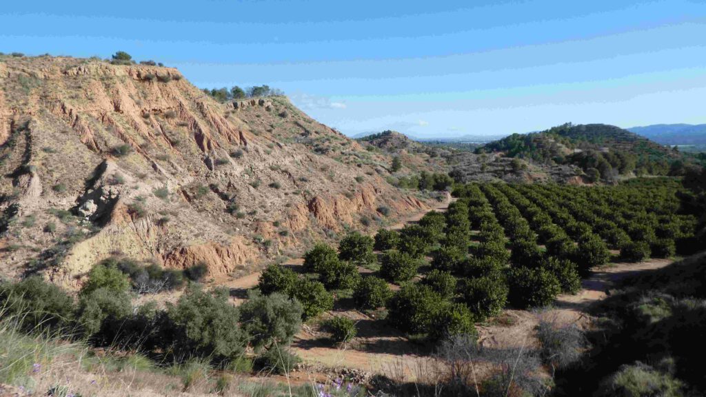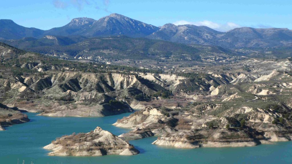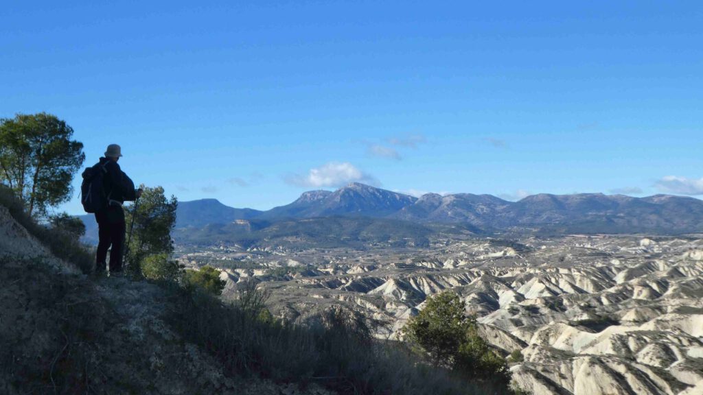 22 januari: de regen van gisteravond en vannacht is gelukkig voorbij en we worden wakker met een strakblauwe hemel. We maken vandaag een rondwandeling vanaf de camperplaats langs het stuwmeer van Gebas. Het eerste gedeelte lopen we tussen de citroenboomgaarden en worden we meteen getrakteerd op het prachtig geërodeerde landschap. Na een korte klim bereiken we het uitzichtpunt over de Embalse de la Rambla de Algeciras. Wat een fantastisch mooi landschap! In de verte zien we de hoge toppen van Sierra Espunta, waar we een andere keer maar eens moeten gaan wandelen, als we meer tijd hebben. Wat heeft Spanje toch een geweldig mooi desolaat landschap.