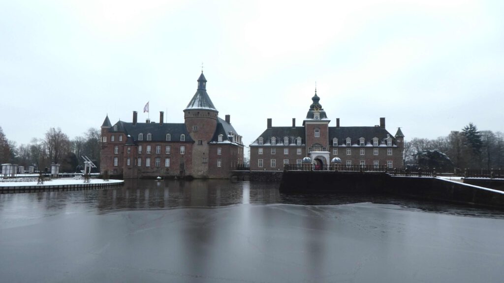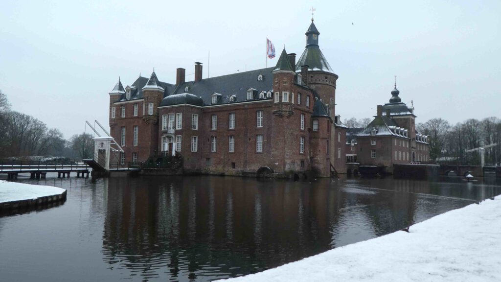 30 januari: met een zonnetje verlaten we de camping en rijden we naar Anholt, waar we de Wasserburg gaan bezoeken. Het kasteel, dat sinds 1641 privébezit is van het vorstenhuis zu Salm en zu Salm-Salm, is een van de weinige kastelen in Noordrijn-Westfalen die nog steeds door een adellijke familie bewoond worden. De oorsprong van de burcht ligt in een versterkte weertoren uit de 12e eeuw, opgericht om het bezit van het bisdom Utrecht te beschermen. Tegenwoordig zijn de bijgebouwen omgetoverd tot een chique hotel en kan men de gehele beneden verdieping met een gids bezichtigen. Het fraaie van dit kasteel is, dat nagenoeg alle originele meubels, wandkleden, servies en de gehele kunst verzameling bewaard is gebleven, terwijl aan het einde van WO II het kasteel nog plat gebombardeerd is door de Engelsen. Helaas mag er binnen niet gefotografeerd worden😞.