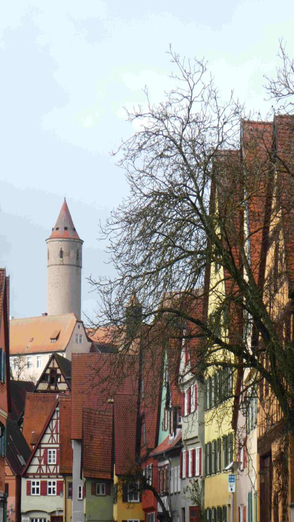 23 februari: Na een prima nachtrust (de kou viel reuze mee) willen we na het ontbijt het stadje bezoeken. Echter blijkt de wc-doorspoeling niet te werken! Gido heeft na een tijdje het euvel gevonden. Op onverklaarbare wijze is het spuitstukje in het watercompartiment verdwenen😧. En niet door kunnen spoelen is geen optie voor de komende maanden! Dus Gido heeft de wc gedeeltelijk gesloopt om dit op te lossen. Gelukkig hebben we tweecomponenten lijm bij ons en zit het spuitstukje nu weer goed vast op de plek waar het hoort te zitten. Dus een uur later wandelen we alsnog het leuke stadje binnen. Dinkelsbühl is een middeleeuws stadje, dat nog geheel ommuurd is. In 1372 is men begonnen met het bouwen van de stadsmuur. Niet ver hiervandaan ligt nog zo’n mooie ommuurde stad, Rothenburg ob der Tauber. Deze plaats hebben we een aantal jaren geleden al bezocht. Beide zijn zeker de moeite waard om naar toe te gaan; heel gezellig en in Rothenburg kun je over de stadmuren wandelen.