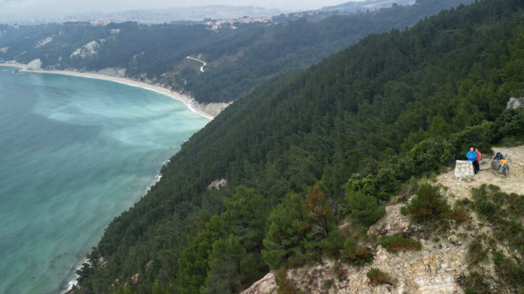 26 februari: helaas wakker geworden van de regen, maar wat een heerlijk rustige nacht hebben we gehad. Er wordt geschreven dat je hier heel mooi kunt wandelen, dus Karin heeft een korte kustwandeling uitgezocht naar een uitkijkpunt. Hier vandaan kan men de rotsformaties Due Sorelle bewonderen, mits het zicht natuurlijk niet door mistdampen belemmerd wordt! Ondanks de lichte regen gaan we dapper op pad en het loont, want op het moment dat wij op de Passo del Lupo aankomen, trekt de bewolking weg en hebben we prachtig uitzicht op de grillige kustlijn. Gido maakt met de drone nog een paar mooie foto’s👍.