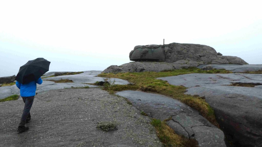 9 mei: Hemelvaartsdag. Als Jezus vandaag vanuit onze locatie ten hemelen zal gaan, dan zal hij onderweg wel een paar keer de weg moeten vragen. Het is namelijk zwaar bewolkt en het miezert, wat later overgaat in gestage regen. Dus een beetje uitgeslapen en daarna van een lekker ontbijt genoten. Vandaag wilden we een stuk gaan fietsen, maar de weergoden beletten ons dit plan uit te voeren. We besluiten een stuk richting Stavanger te rijden. In Egersund nog een tussenstop gemaakt bij de begraafplaats om vers water in te slaan. Onderweg bezoeken we het Syrevag Kystfort. Hier hebben de Duitsers in de 2e wereldoorlog wederom een fort laten bouwen om de kust en de lucht te verdedigen. Met nadruk ‘laten bouwen’, omdat de Duitsers alleen de plannen hebben gemaakt. De bouw was natuurlijk uitbesteed aan hun slaven, de krijgsgevangenen en de gedwongen arbeidskrachten. Zo deden de Romeinen het vroeger overigens ook. Nog iets wat de Duitsers van de Romeinen overgenomen hebben. Indrukwekkend zijn de tunnelsystemen die ze in de rotsen hebben uitgehouwen, met open ruimtes en diverse trappen. Zeer stevig, maar toch niet een oord waar we zouden willen vertoeven als de bommen op het dak zouden vallen.