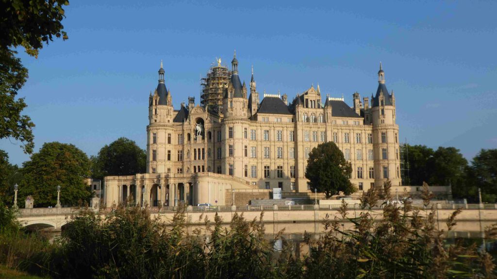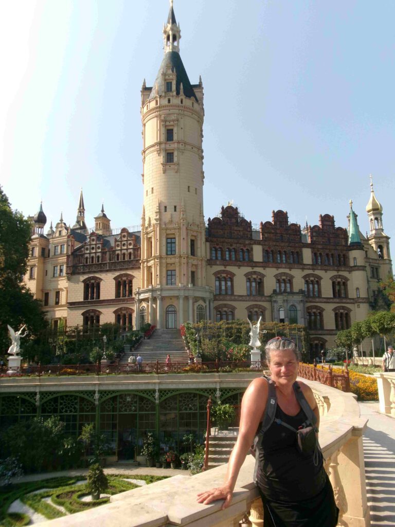 4 september: we worden wakker van het onweer boven ons hoofd. Het rommelt zeker een uur en dat is voor ons een teken om rustig op bed te blijven liggen. We hebben geen druk programma vandaag. We verkassen een halfuur rijden naar een groot grasveld bij het meer Camber See, waar een strandtent gerund wordt. Hier kunnen we water halen en gebruik maken van de wc en de douche, speciaal voor de camping gasten👍. Heerlijk ongedwongen en zalig zwemwater! Na de lunch pakken we de fiets naar het stadje Schwerin, de hoofdstad van de regio Mecklenburg-Vorpommern. Rond 1500 werd met de bouw van het slot begonnen, dat de zetel van de hertogen van Mecklenburg werd. Nu zetelt in het prachtige slot het deelstaatparlement op de begane grond en op de eerste verdieping. Op de tweede verdieping bevindt zich het prachtige museum, wat wij gaan bezoeken. Na ons weer vergaapt te hebben aan alle pracht en praal, wandelen we de stad in die voornamelijk bestaat uit statige gebouwen. Gido wil absoluut en eindelijk eens schnitzel met patat eten, dus we gaan zitten bij een Gasthof en smullen van de Duitse keuken met een halve liter bier natuurlijk! Daarna moeten we nog wel 16 km terug naar de caravan fietsen, maar het valt mee. Aangezien het nog steeds ’s avonds lekker weer is, duiken we nog een keer het meer in. Een heerlijke dag👍.