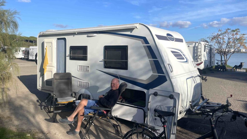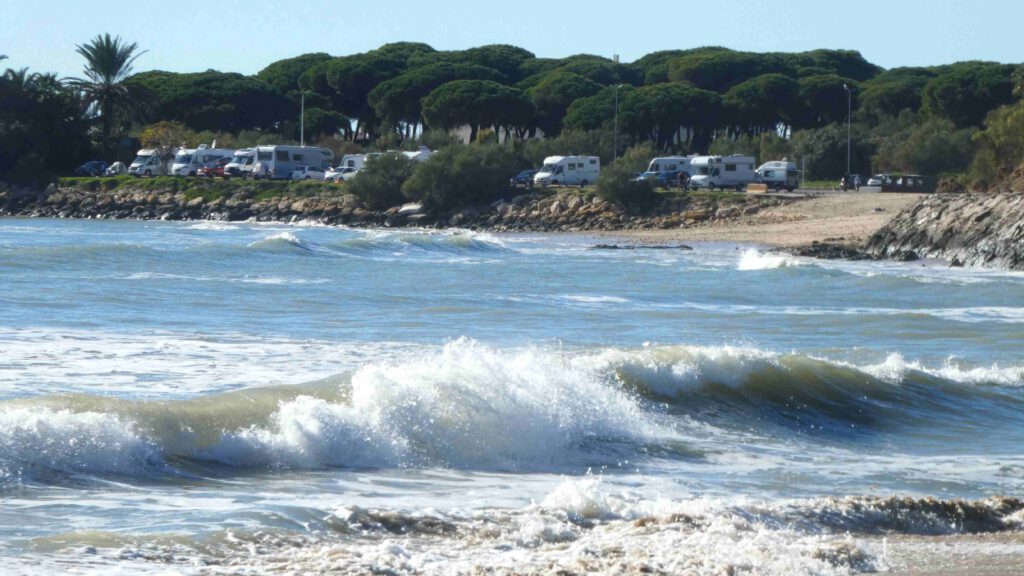 7 december: wat een stilte! We staan weliswaar dan ook in de middle of nowhere, maar zo’n stilte hebben we nog niet mogen ervaren; er waren anders in de buurt altijd wel een paar honden die zich ’s nachts lieten horen. Hier nada. We ruimen rustig alles weer in en rijden na het ontbijt naar de kust. Ons volgende kampeerplekje is een parkeerplaats met andere campers bij het plaatsje El Puerto de Santa Maria, net onder de ‘rook’ van Cadiz, met uitzicht op het strand en de zee. Hier blijven we staan totdat onze wc vol is😉, of totdat de zon zich niet meer laat zien. Gido wil vandaag niets meer doen, want Max racet om 14.00. Karin kijkt de start nog even mee en gaat daarna een wandeling langs het strand maken. Het is 7 december, maar het voelt als mei/juni in Nederland, heerlijk! Max wint, maar Lando Norris is met twee punten verschil toch wereldkampioen geworden. Morgenavond zal Karin een spannende handbal wedstrijd gaan kijken. Is toch veel leuker dan al die rondjes rijden?