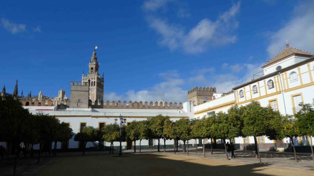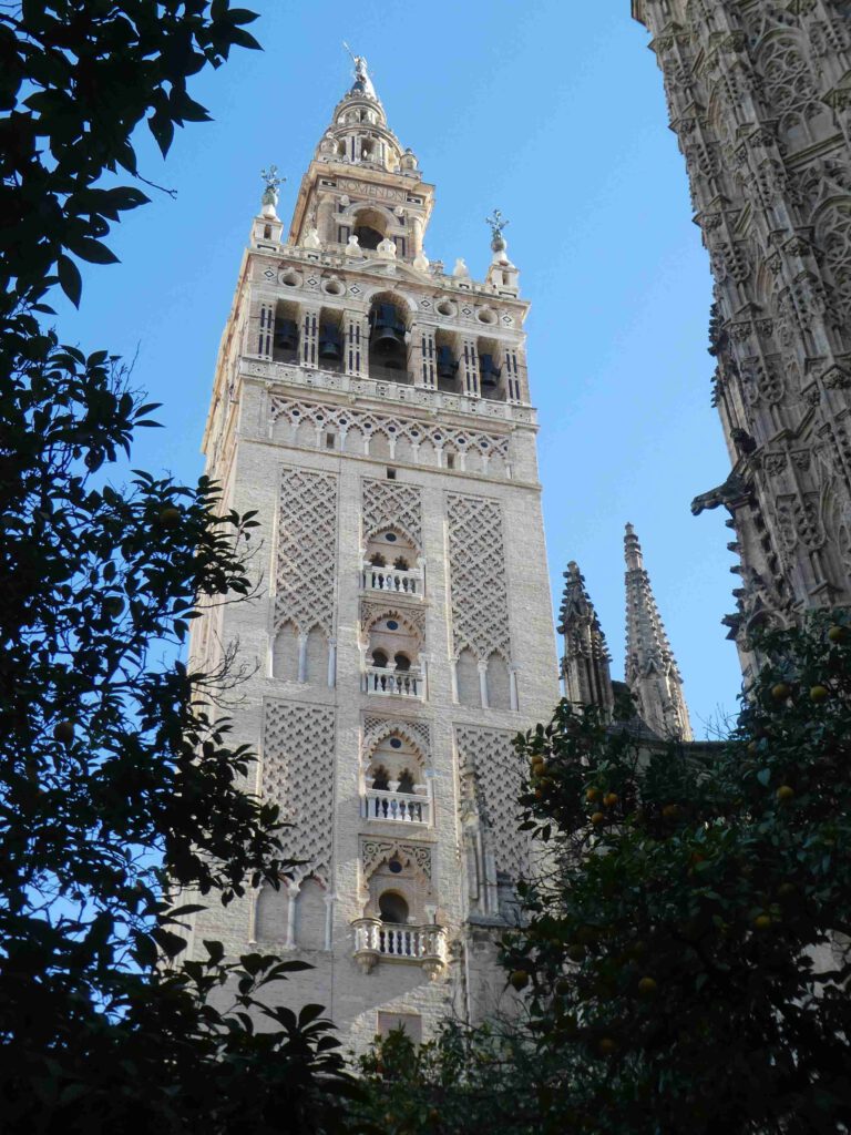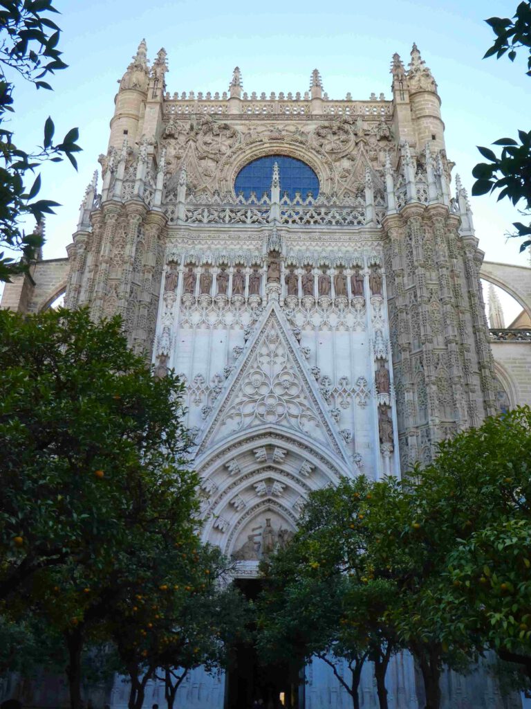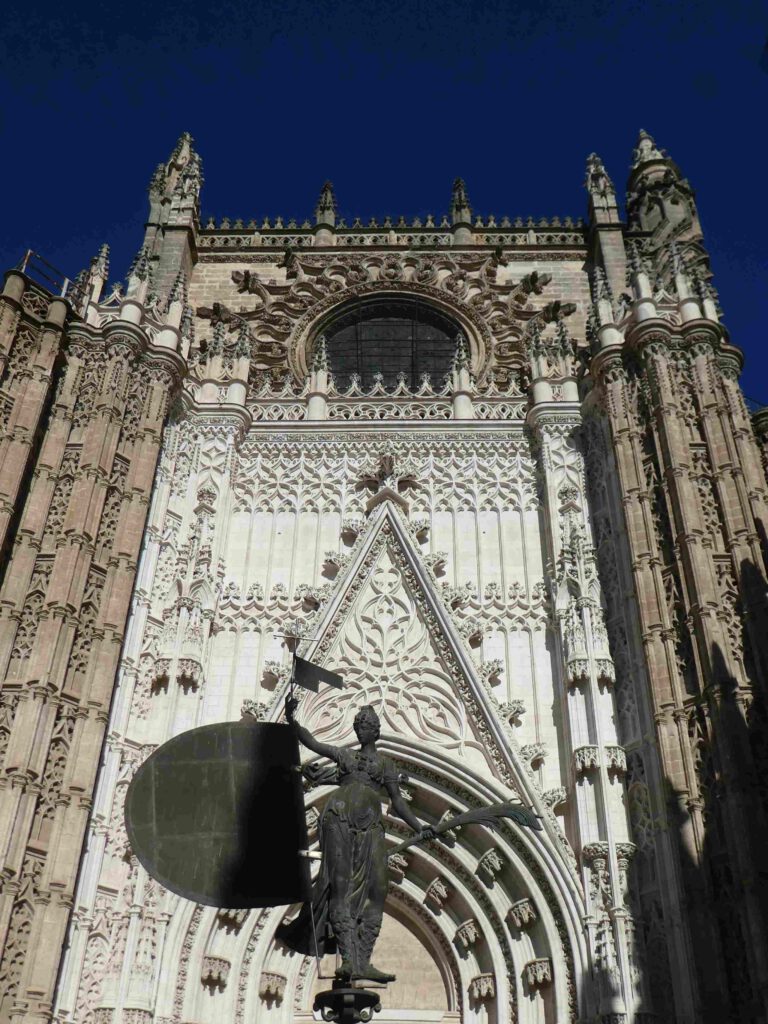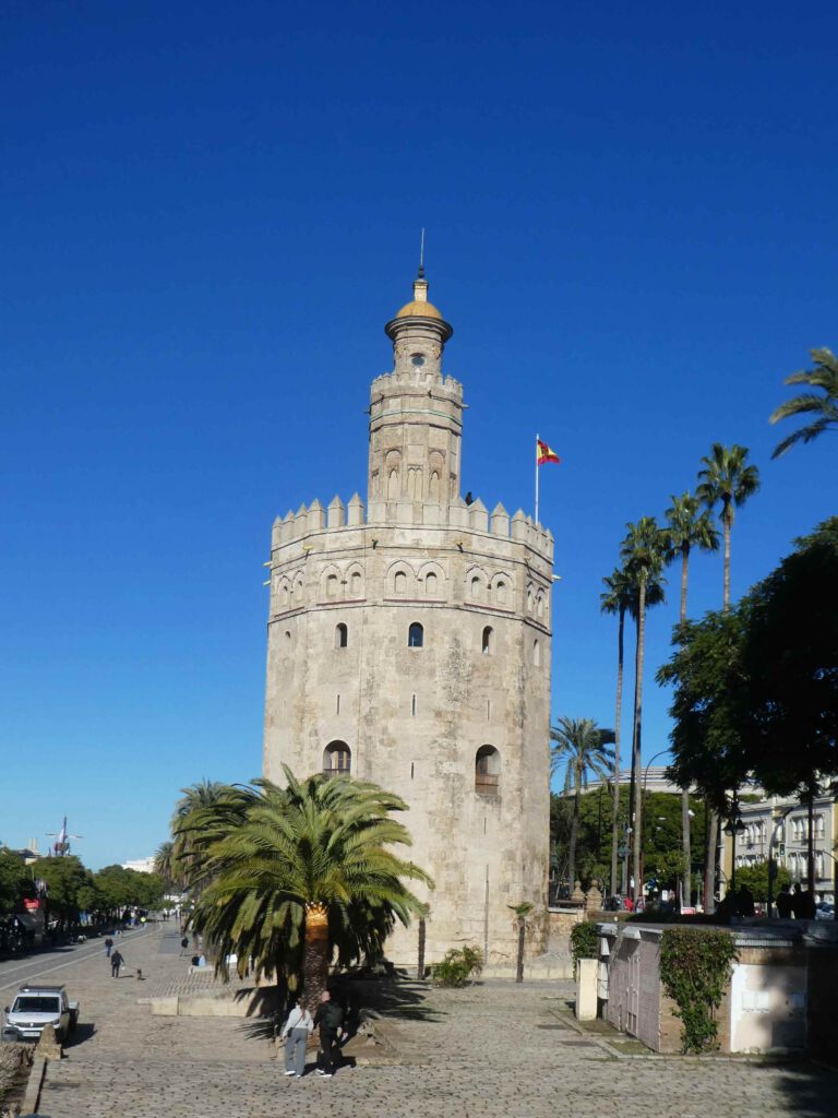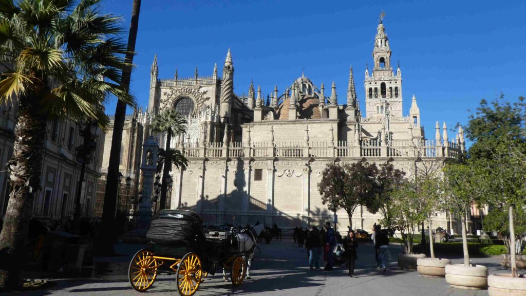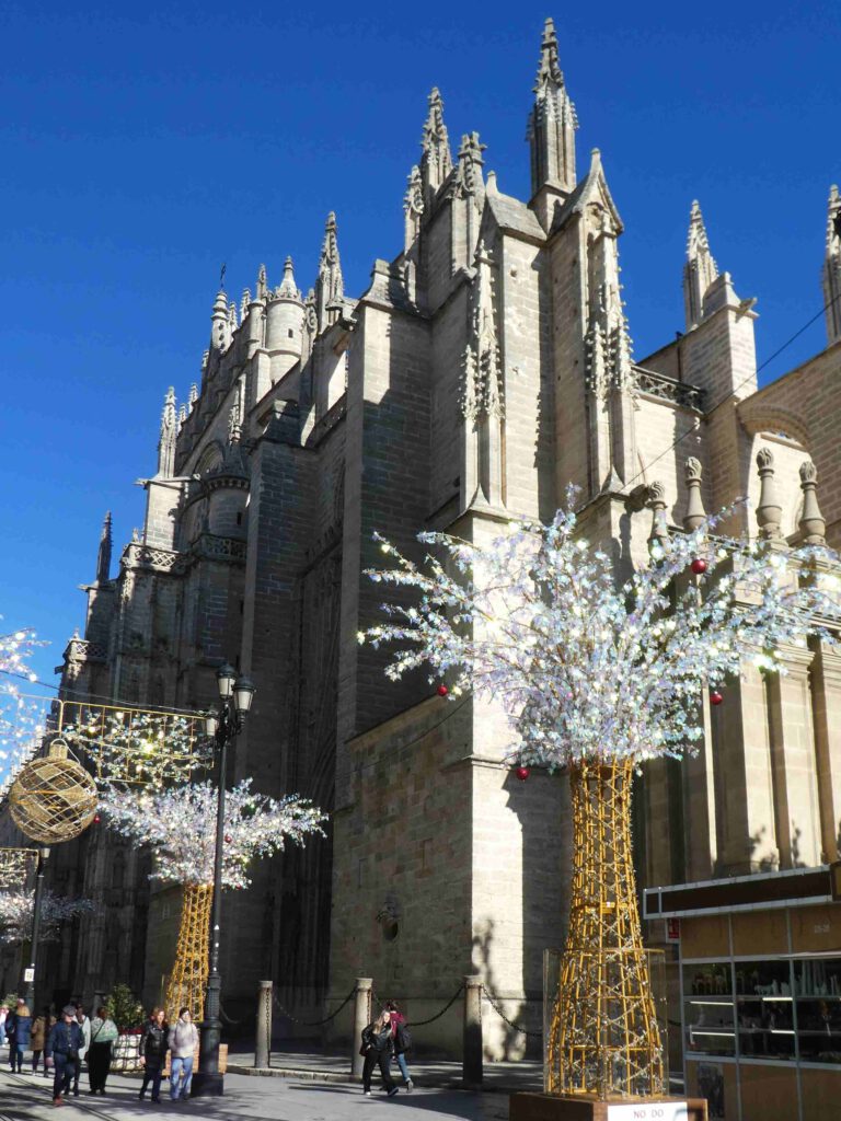 3 december: na een heerlijke rustige nacht, stappen we in de auto en rijden we naar een grote parkeerplaats in de wijk Condequinto, alwaar we de metro richting het centrum pakken. Dit is natuurlijk veel relaxter dan de binnenstad in te rijden en op zoek te gaan naar een parkeerplek😉. We komen weer boven de grond bij de Torre del Oro, uit 1220 na Chr. aan de rivier Guedalquivir. We wandelen langs de rivier richting het stierenvechtersstadion, om dan door te steken richting de beroemde kathedraal. Ook nu weer gaan we gewoon op de bonnefooi en dat is in dit seizoen geen enkel probleem. Voor 14 euro lopen we naar binnen in deze gigantische ruimte. We dachten in Burgos al wat gezien te hebben, maar deze gotische kathedraal slaat echt nergens op! Het ene pronkstuk na het andere en alles groter dan groot. De Giralda klokkentoren, van oorsprong de minaret van toentertijd de moskee uit 1200 na Chr., is 104,5 meter hoog en deze moet je echt beklimmen, om te genieten van het mooie uitzicht over de stad. Na ruim een uur alles aanschouwt te hebben zijn onze ogen en voeten moe geworden, en Gido’s nek stijf van het naar boven kijken, en ploffen we neer voor de lunch.