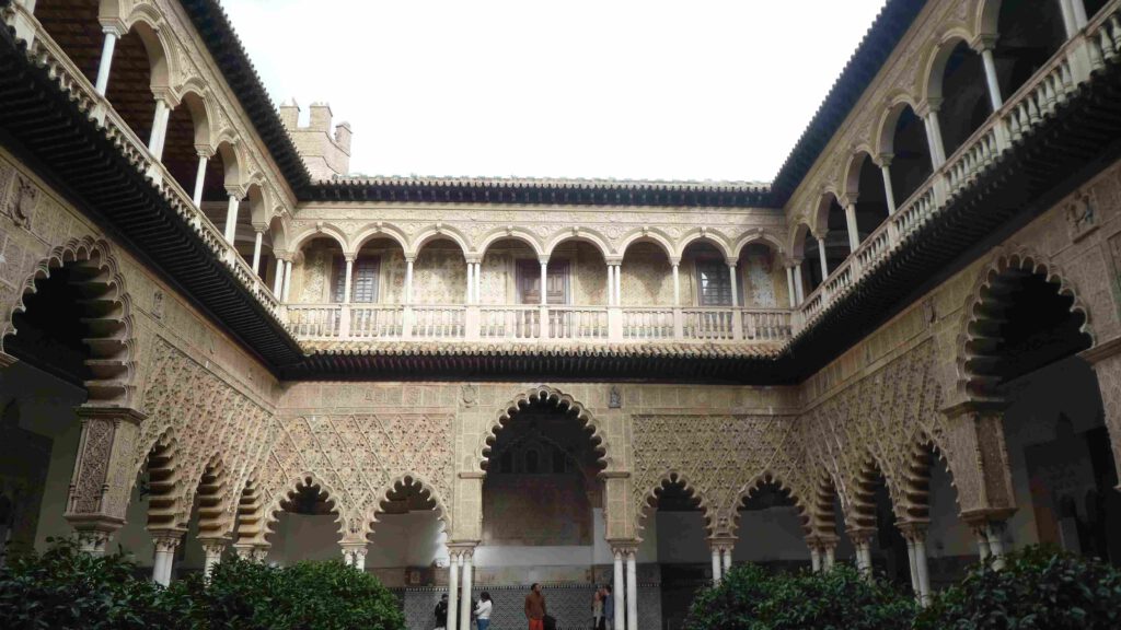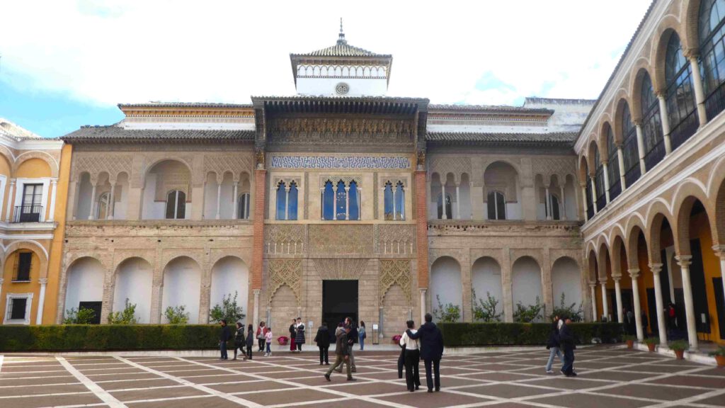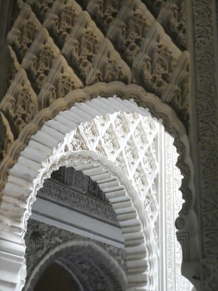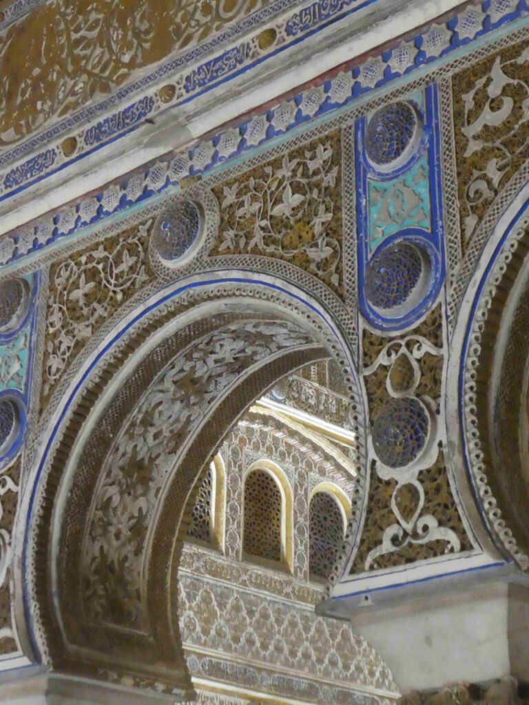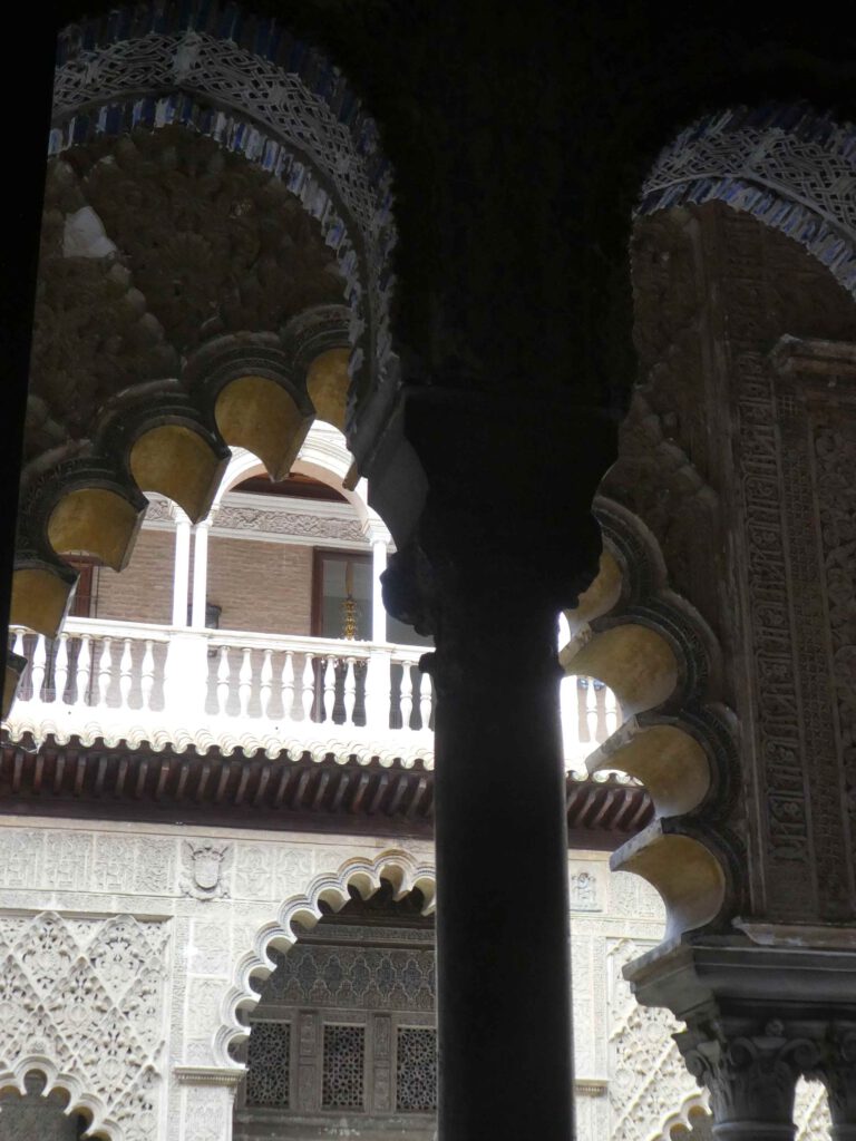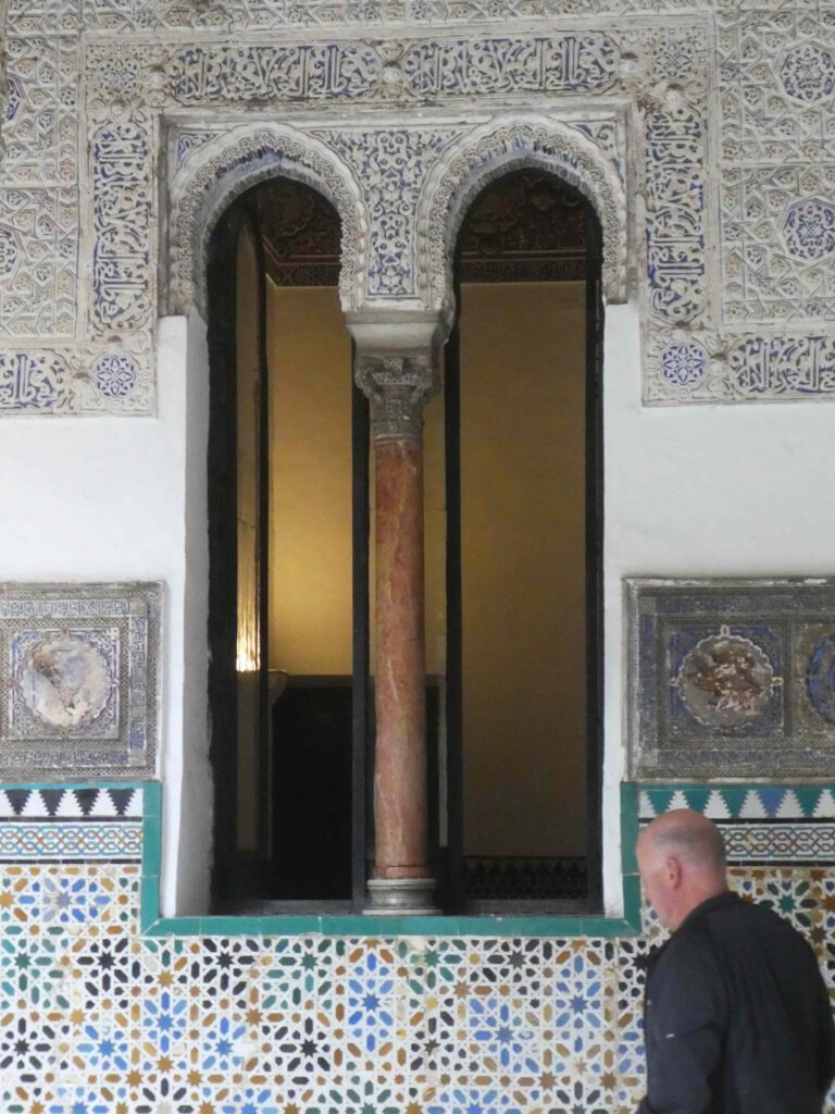 5 december: we hebben deze ochtend wat administratie te doen en enkele telefoontjes te plegen, waardoor we pas na de lunch (gebakken eieren met spek😊) naar Sevilla rijden. Vandaag staat het Moorse paleiscomplex Alcazar Real de Sevilla op het programma. Dit is waarschijnlijk het oudste koninklijk paleis van Europa dat nog steeds als zodanig in gebruik is. Oorspronkelijk stond op de plek van het Alcázar een Romeins fort. In 913 gaf Abd-ar-Rahman III, de eerste kalief van Al-Andalus, opdracht tot de bouw van een kasteel op de plek. In 1364 gaf koning Peter I van Castilië opdracht tot de bouw van het huidige paleis op de locatie. Peter gebruikte veel Moorse bouwmeesters, die het rijk versierde paleis een duidelijk Moorse stijl gaven. Het Alcázar werd verder uitgebreid door latere koningen. Zo voegde keizer Karel V in de 16e eeuw elementen in gotische- en renaissancestijl toe aan het paleis. We gaan in de kleine rij staan om tickets te kopen en hierbij wordt naar onze ID-kaarten gevraagd. Wanneer we door de Leeuwenpoort heen lopen, worden onze kaartjes gescand en moeten we wederom onze ID-kaarten laten zien (de tickets staan op naam), waarna we door scanpoorten gedirigeerd worden, alvorens we het complex binnen mogen stappen😯. Maar goed, het is het allemaal waard, want wat is het een schitterend gebouw! We raken elkaar al gauw kwijt, want er is zoveel moois te zien. Karin geniet weer volop met het fotograferen van de prachtige geometrische vormen, terwijl Gido zichzelf verliest in de mooie palmentuin. Gelukkig weten we elkaar na meer dan anderhalf uur weer te vinden bij de uitgang😂.