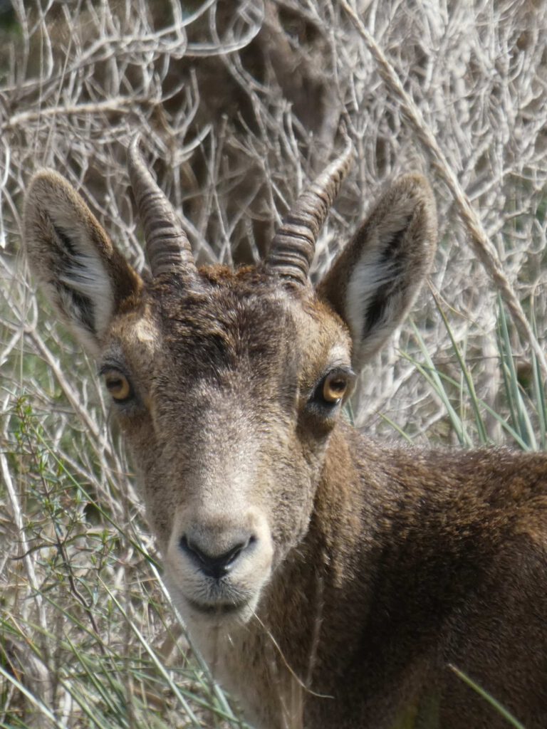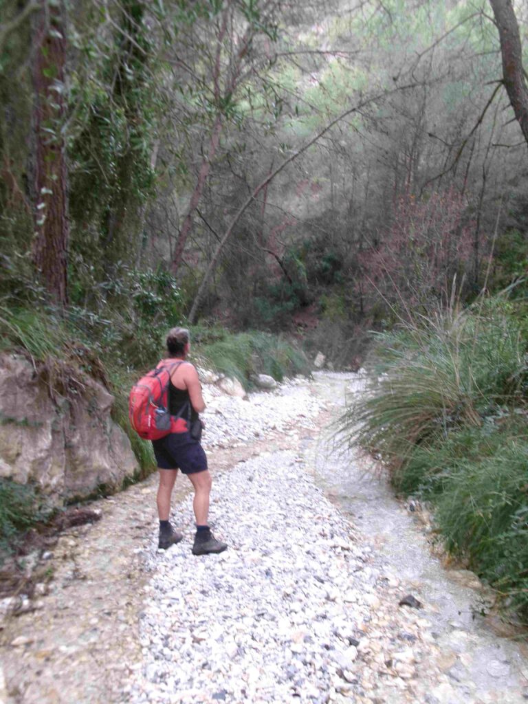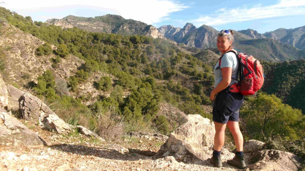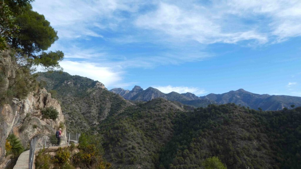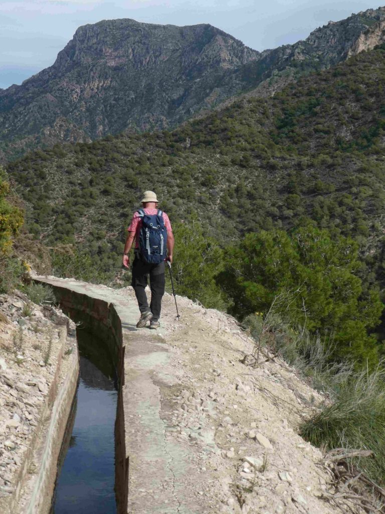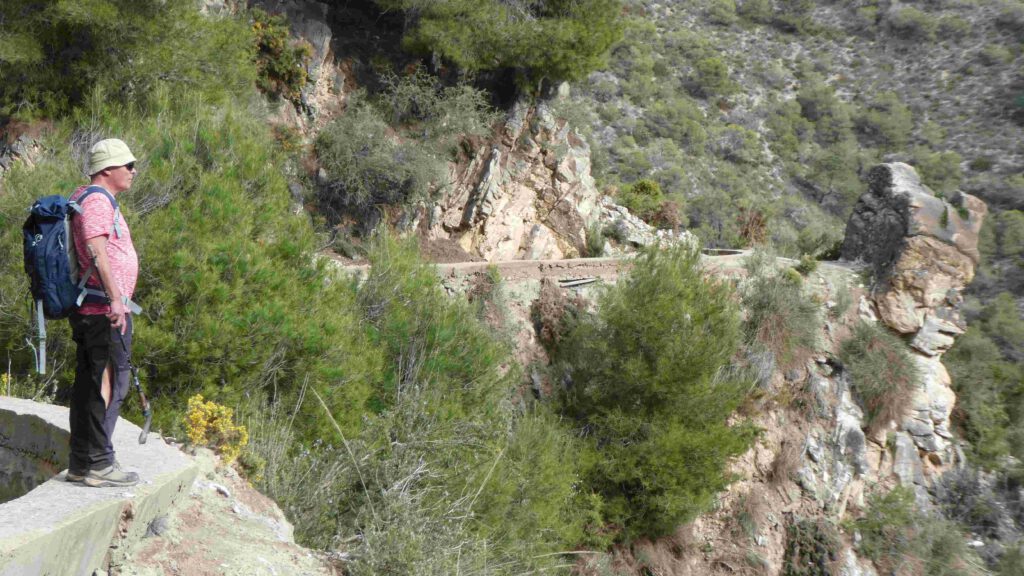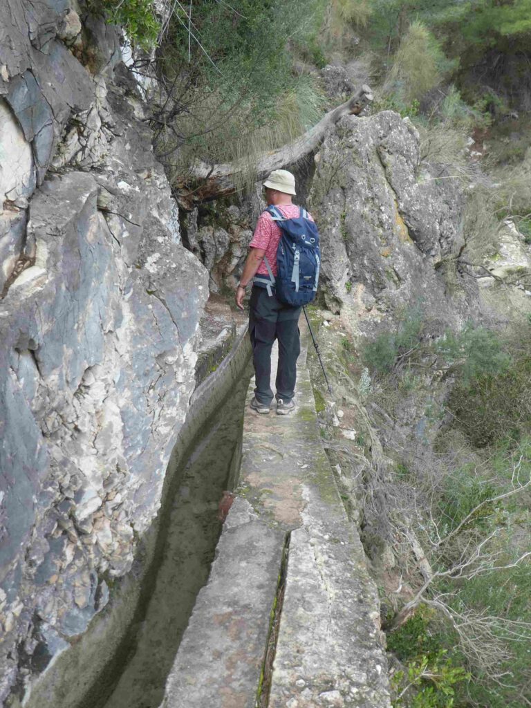 Het eerste gedeelte van de rondwandeling gaat langs een irrigatiekanaal, dat we een uurtje volgen door een prachtig berggebied. Het is maar goed dat er op grote delen van de route een vangnet is gemaakt, want een misstap is zo gemaakt😱. We genieten van het uitzicht en nemen rustig de tijd voor dit traject. Een steenbokken paadje brengt ons naar beneden naar de rivier Higueron.