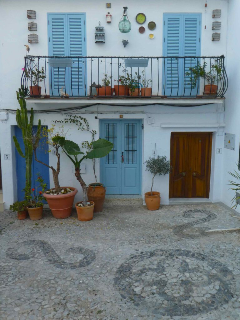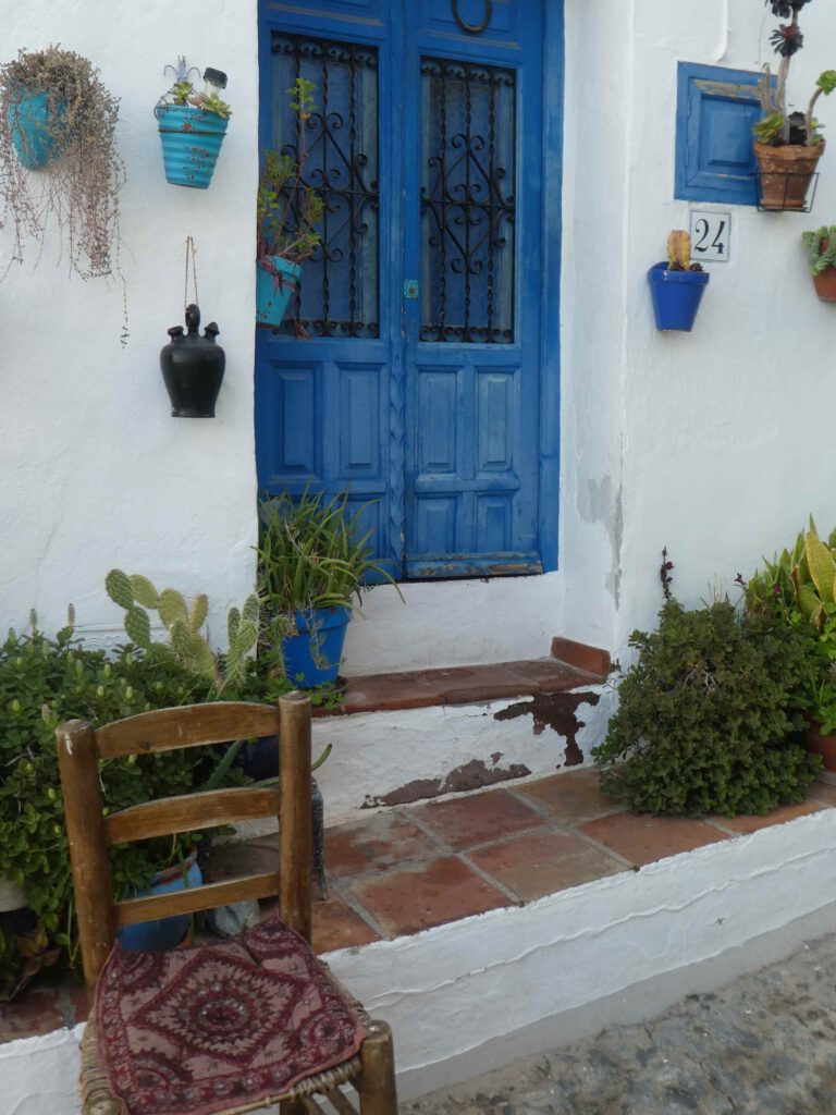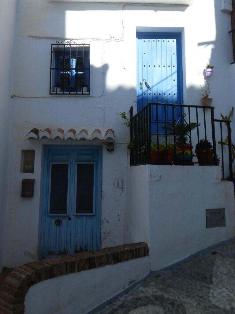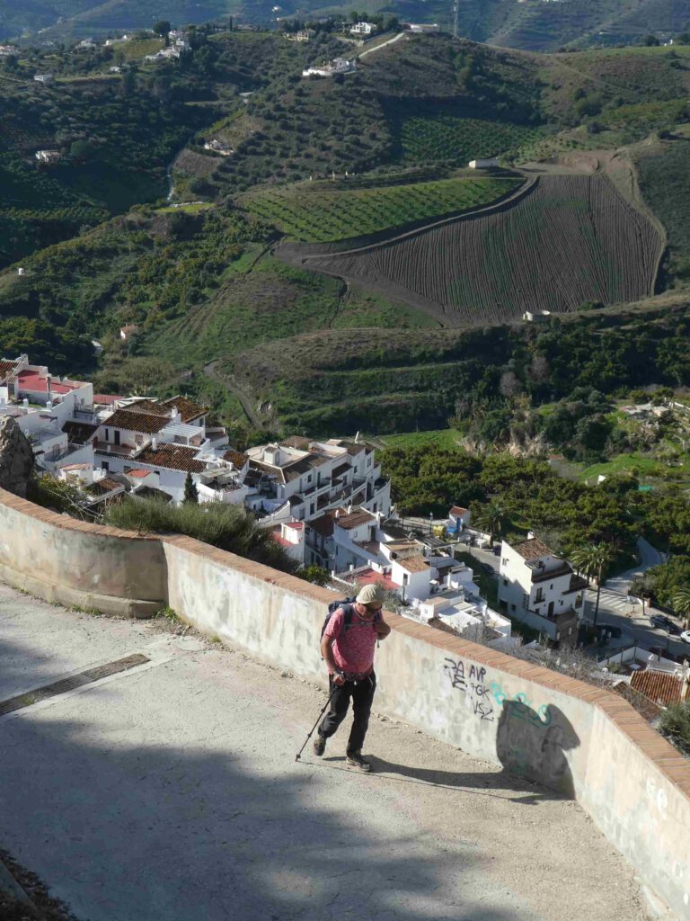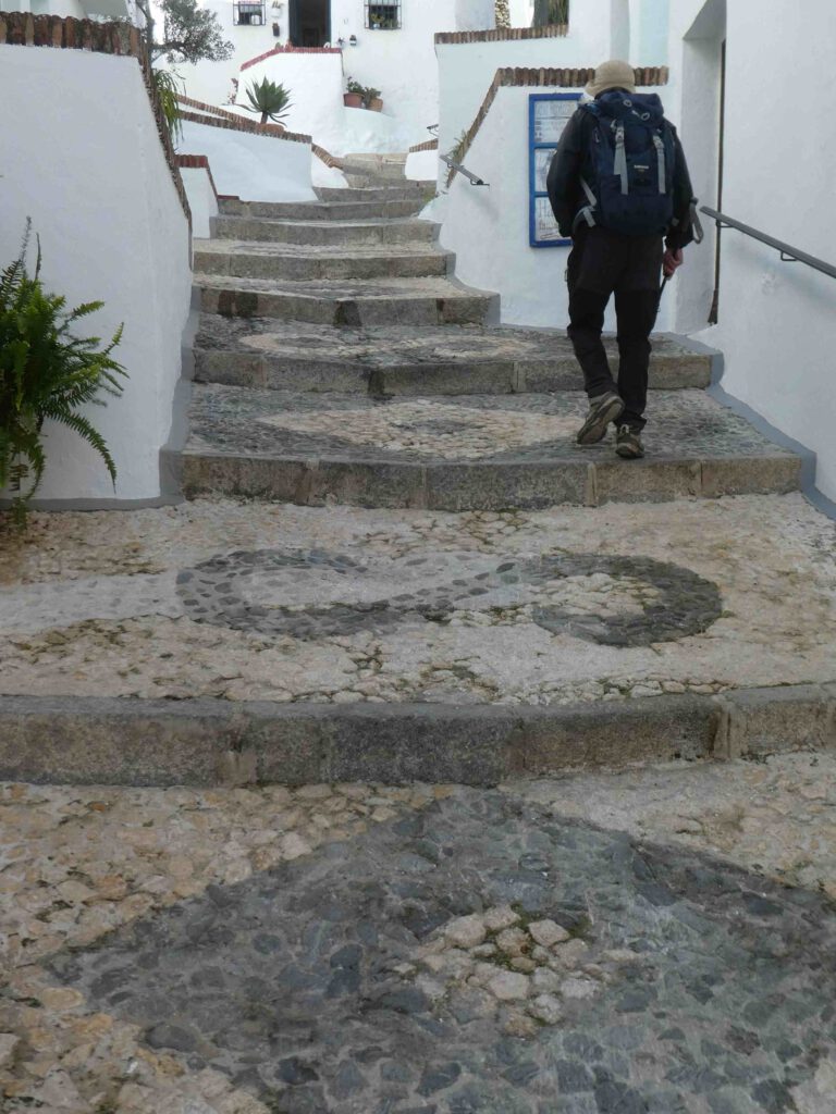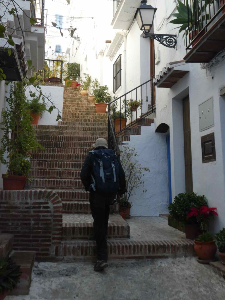 13 januari: het belooft een mooie dag te worden en na een paar dagen luieren en bijkomen op het strand, wordt het tijd om actief te zijn! We rijden naar het pittoreske bergdorp Frigiliana, dat kennelijk vermeld wordt in alle gidsen over de hele wereld, want het wemelt er van de toeristen😧. Deze dagjesmensen gaan gelukkig niet dezelfde bergwandeling maken als wij, maar blijven door de met prachtige mozaïeken straatjes van het witte dorp met blauwe deuren slenteren. Ook wij zullen er aan moeten geloven en klimmen eerst weer steil omhoog door het dorp naar het beginpunt van de wandeling en laten de menigte achter ons.