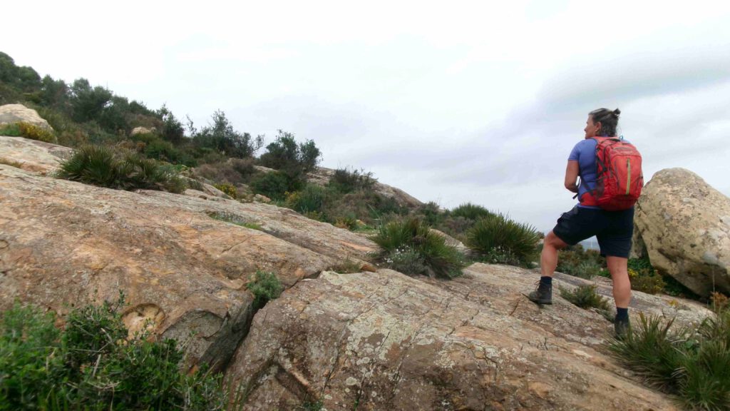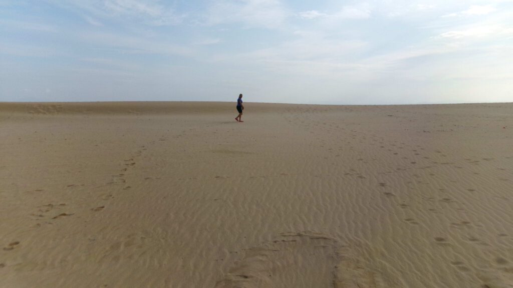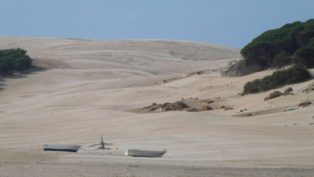 De bedoeling was om een rondwandeling te maken, maar het paarse lijntje is niet meer te vinden in de natuur😂. Dus zit er niets anders op, dan dezelfde weg terug af te glibberen naar de auto. De regen heeft de kleiondergrond tot een modderpoel getransformeerd, maar we blijven overeind. Op de terugweg slaan we nog even af naar de grote zandverstuiving van Punta Paloma. Tja, daarbij vergeleken zijn de Schoorlse duinen ukkies. Het blijft mooi om te zien hoe de natuur gewoon haar gang gaat.