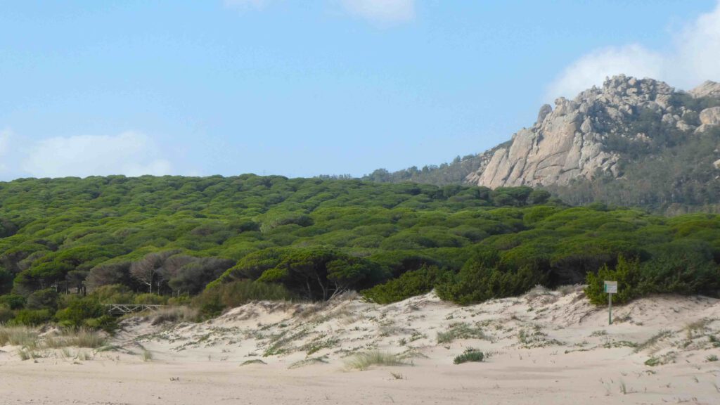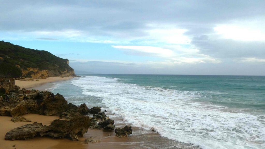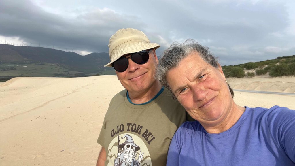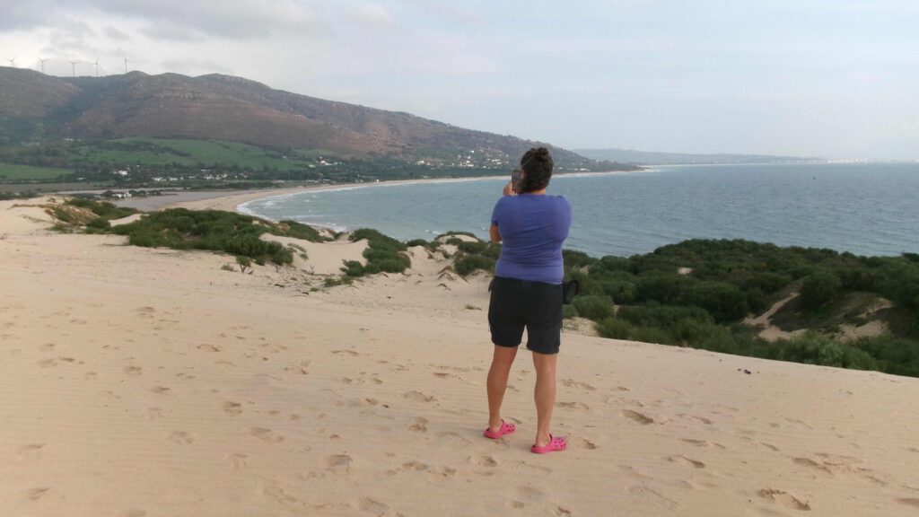 Na de lunch maken we nog een strandwandeling en hebben we goed zicht op het 30 meter hoge zandduin van Bolonia. De groene parasoldennen steken mooi af tegen het witte zand en de kale rotsen. Tegen het eind van de middag rijden we naar camping Torre de la Pena, waar we tussen de golf- en kitesurfers staan. Bijna de hele camping staat vol met overwinterende Duitsers😯. Al die weken of zelfs maanden op dezelfde plek staan, dat trekt ons absoluut niet.