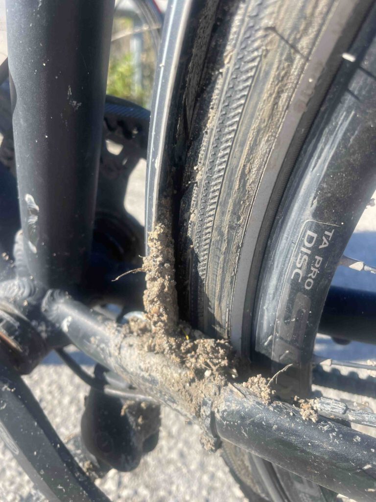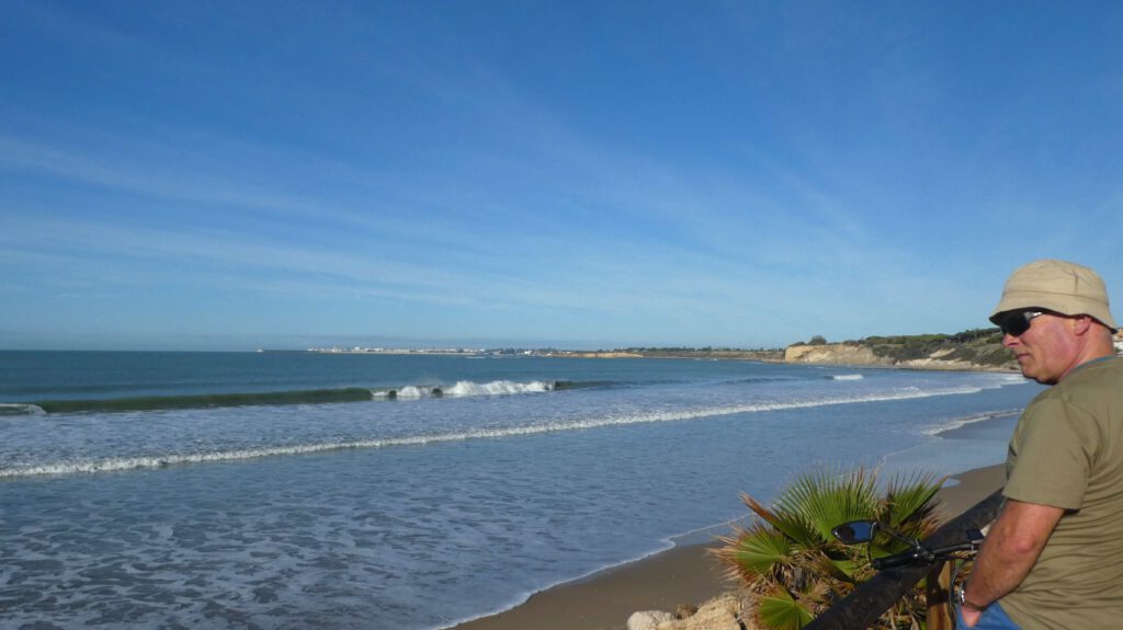 11 december: paarse lijntje volgen. Esther en Simon weten hier alles van. Wanneer je een fietsroute hebt uitgestippeld en het pad opeens ophoudt, wat doe je dan?! Natuurlijk verder zoeken naar een alternatief, maar deze zijn meestal niet best😂. Vanwege de dag rust gisteren en het mooie weer vandaag leek het ons een goed plan op de fiets te stappen. Het eerste deel van de route kennen we al, want dat hebben we laatst nog gefietst. Onderweg kunnen we mooi een klasje surfers bekijken, die de golven probeert te bedwingen. De tocht verloopt voorspoedig, totdat we tegen een hele grote marinebasis aanfietsen en er omheen moeten. Op zich geen probleem, maar we dreigen op een gegeven moment de snelweg op te fietsen! We bedenken ons geen twee keer en draaien om. Gido gaat bij de marinebasis vragen hoe we met de fiets moeten rijden, zodat we bij de stad Rota aankomen. Helaas, de bewaking heeft geen idee hoe de wereld eruit ziet buiten de basis en we worden weggestuurd.😂 Karin ziet een alternatief op Maps.me en we komen daarbij op een grind/zandpad parallel aan de snelweg. Maar ja, wat doet zo’n pad na een hele dag regen🤔? Precies! In een grote modderpoel veranderen. Op de een of andere manier zitten de spatborden van Karin dichter op de banden dan die van Gido, want de steentjes gecombineerd met zeer kleverige kleimodder blijven steken, waardoor de snelheid aardig omlaag gaat door vastlopende banden. En dan hebben we het nog niet over hoe haar benen eruit komen te zien😂. Niet zeuren, af en toe de modder wegsteken en weer verder fietsen is het devies. Totdat het pad onderbroken wordt door een riviertje, dat we door de hoge greppel niet kunnen oversteken😯. Er zit niets anders op dan om te keren. Vandaag komen beelden van Esther en Simon onderweg in Laos veelvuldig langs in onze hoofden. Maar ja, wij hoeven niet verder te fietsen en kunnen relaxed terugfietsen richting het strand. Daar pakken we onze rustpauze met een welverdiende lunch aan het strand. Wat is het leven toch mooi! Na de lunch neemt Gido nog een duik in de oceaan, terwijl Karin het bij haar benen schoon schrobben houdt. Al met al weer een heerlijke dag! Morgen verlaten we deze gratis plek en zoeken we een camperplaats op. Een douche is wel weer eens nodig, zeker na vandaag😉.