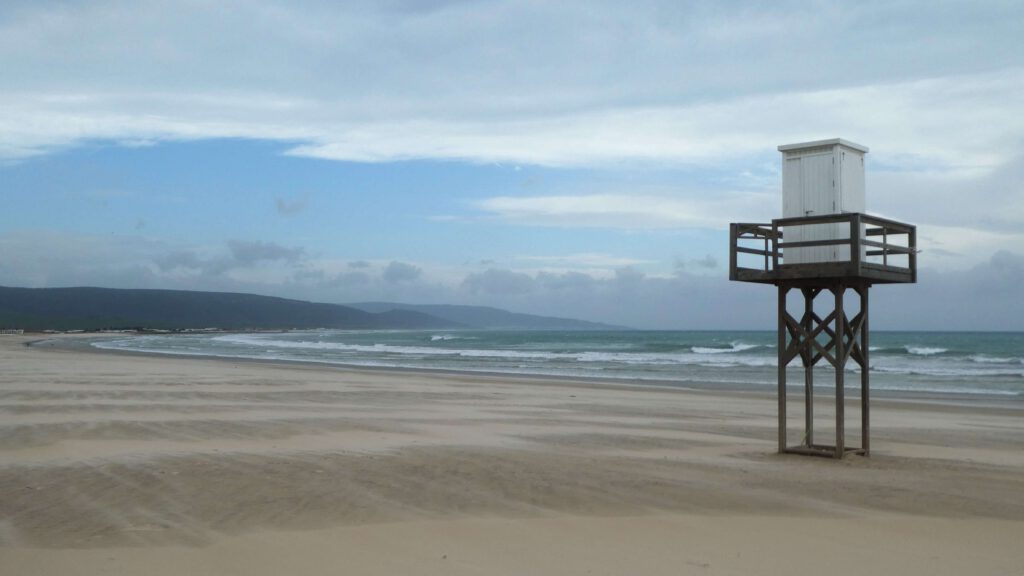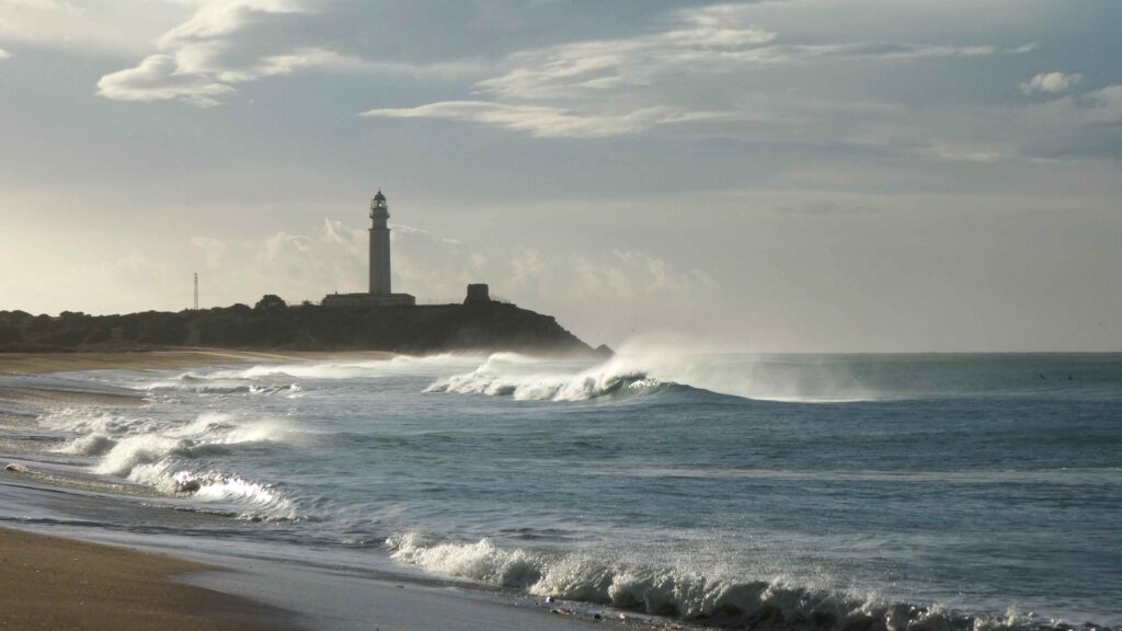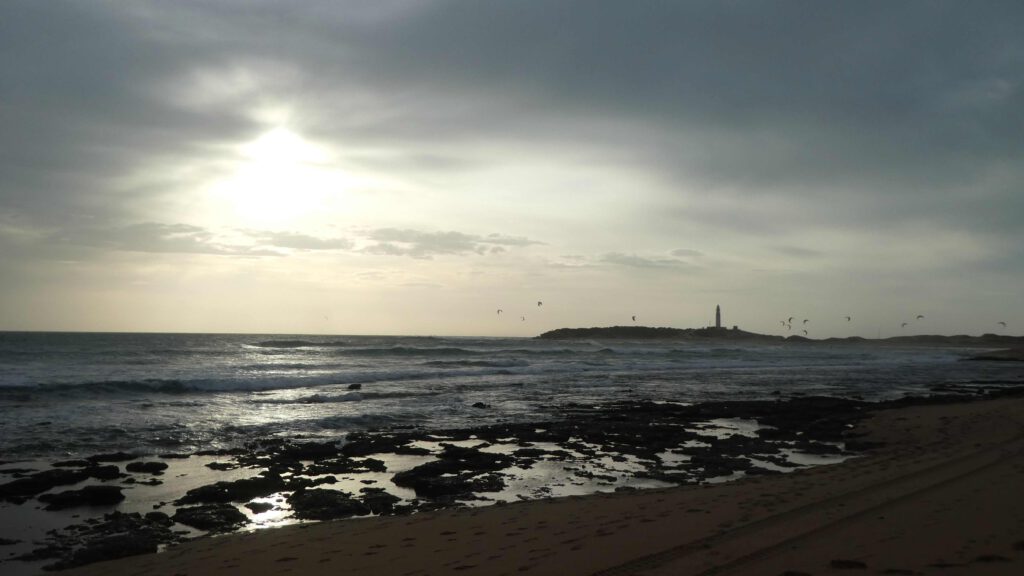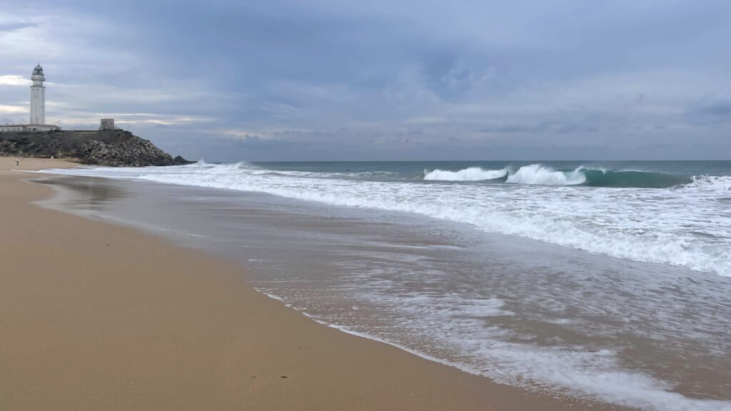 12 december: vanmorgen zijn we opgestaan met een mooie zonsopgang. Voordat we naar onze volgende kampeerplaats gaan, rijden we nog langs een wasstraat. De fietsen hebben een zeer stevige douche nodig na ons avontuur van gisteren en de caravan kan ook wel een waterstraal gebruiken. Karin heeft een plekje gevonden bij particulieren in de tuin, pal aan het strand. Is goedkoper dan een camping en veel fijner om te staan. Barbate en Vejer de la Frontera zijn vlakbij, zodat we deze plaatsen gemakkelijk kunnen bezoeken zonder caravan. Er staan nog twee Duitse campers op het terrein, eentje al 9 jaar😯 en een echtpaar die hier een maand overwintert. Na de lunch maken we een lange strandwandeling naar de vuurtoren van Kaap Trafalgar. Gido denkt dat hier in het verleden een zeeslag is uitgevochten tussen Spanje en Engeland. Enig idee waarom?
